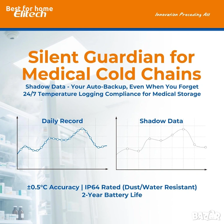 Приложение: Идеален за хладилни витрини, аптеки, медицински лаборатории, складове за храни, оранжерии или транспорт на термолабилни стоки.