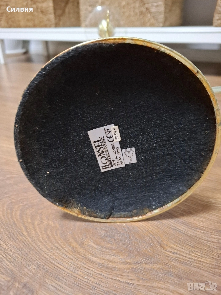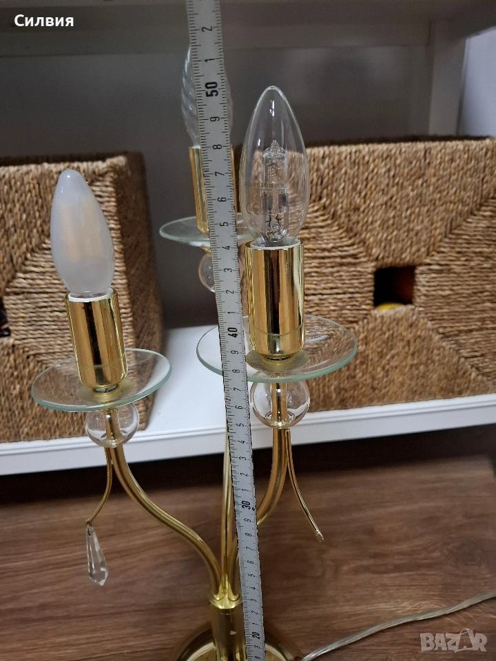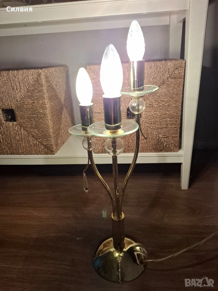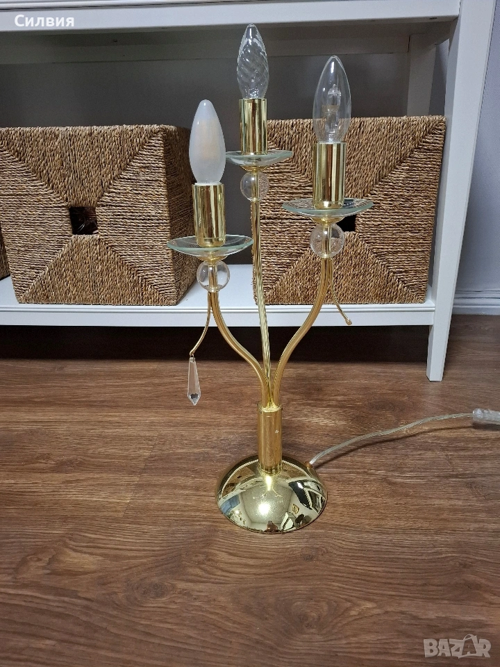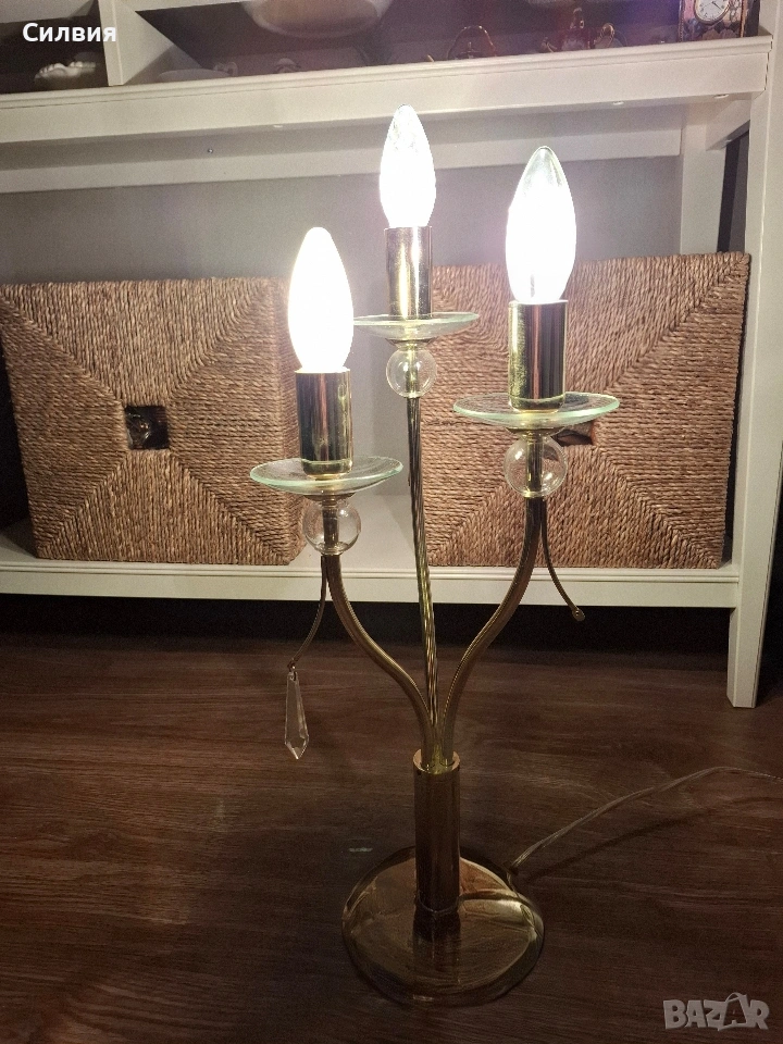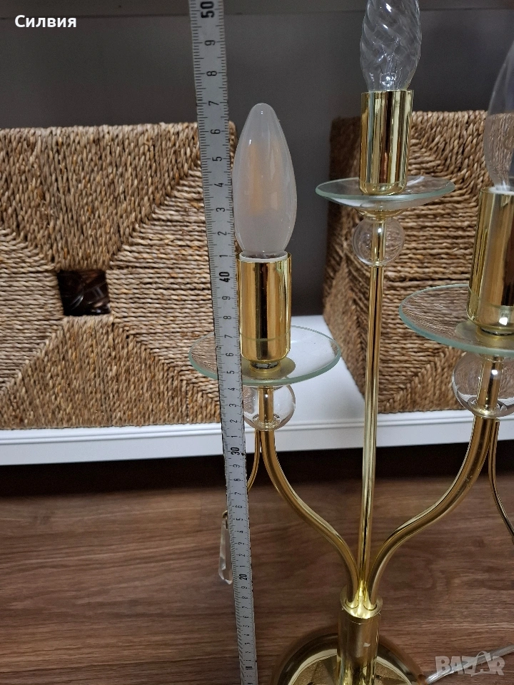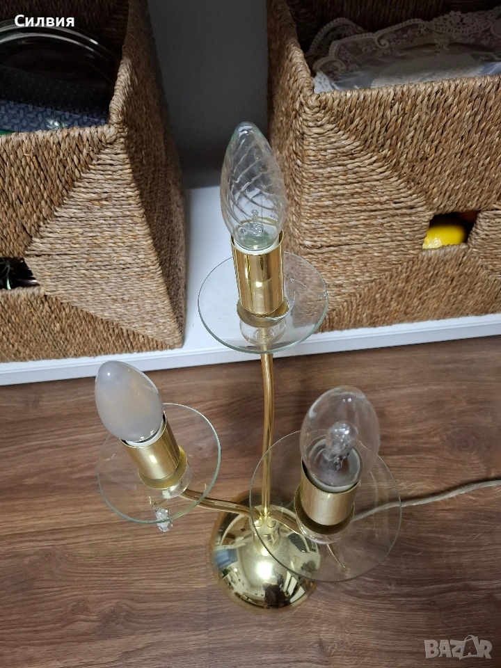 лампа Honsel Leuchten (Германия) – Класически шик Настолна лампа тип „канделабър“ от немски производител Honsel Leuchten. Лампата е с три рамена и впечатлява със своя златист блясък и деликатни стъклени детайли. Основа от метал в цвят „злато“ с три извити рамена, всяко завършващо със стъклена подложка и декоративни елементи. Размери: Височина около 54 см. Предназначена за 3 крушки тип E14. Състояние и забележка: Функционалност: Лампата е напълно работеща. Оригинален кабел с копче за включване и изключване. Забележка: Една от стъклените подложки под крушките има пукнатина. Дефектът е отразен в цената и при правилно завъртане на лампата остава почти незабележим, но е важен за коректността на обявата. Останалите части и златистото покритие са в много добро състояние. Цена 3️⃣5️⃣€ 《68,45лв 》•✽✧✽•°”˜🦋”°•✽✧✽•°”˜🦋”°•✽✧✽•°”˜🦋”°•✽✧✽•°”🦋˜”°•✽✧✽•