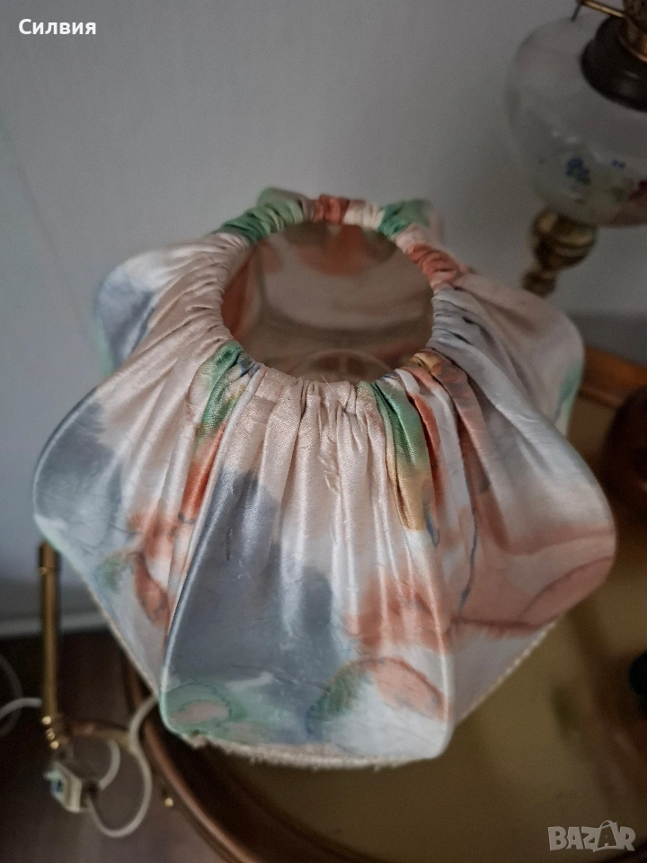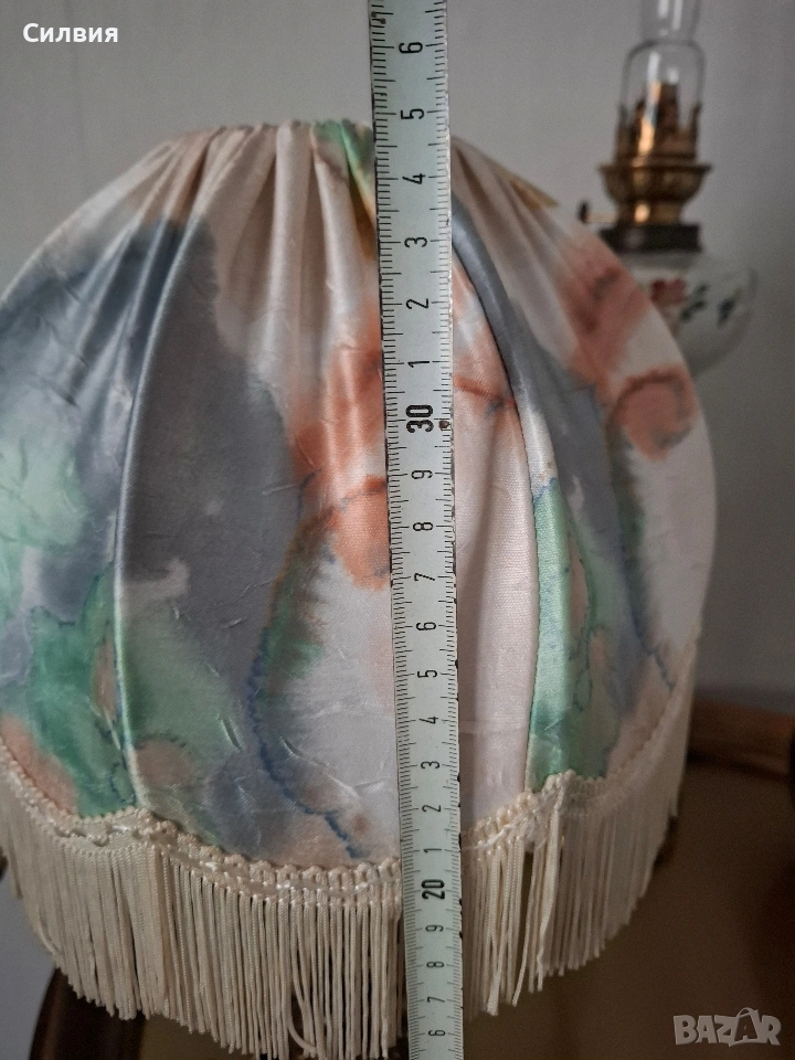 Абажур: Абажурът е от плат, сегментиран, с вълнообразен долен край, украсен с ресни. Мотивите са абстрактни.