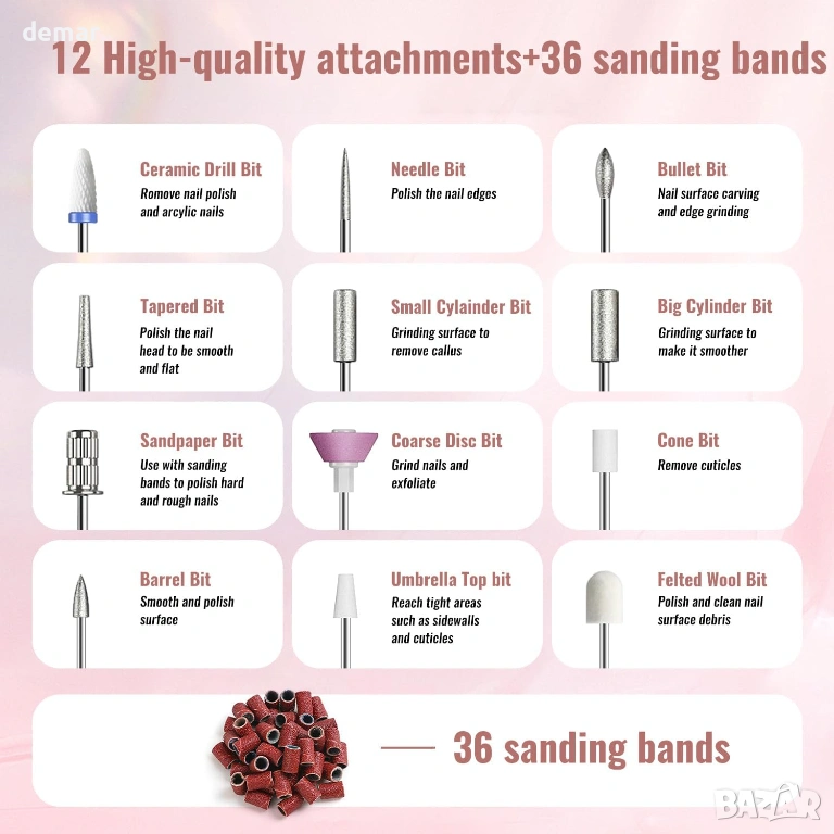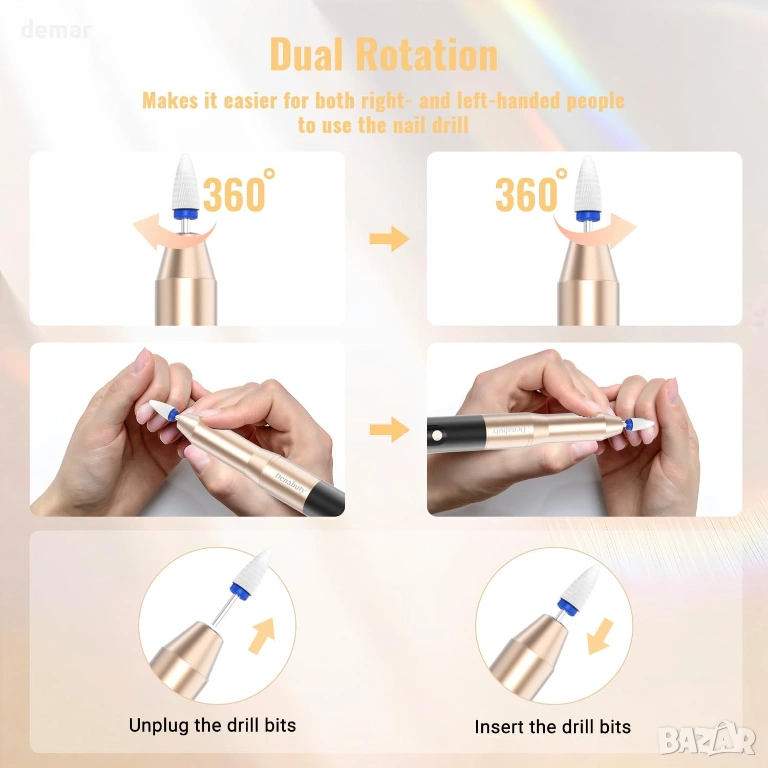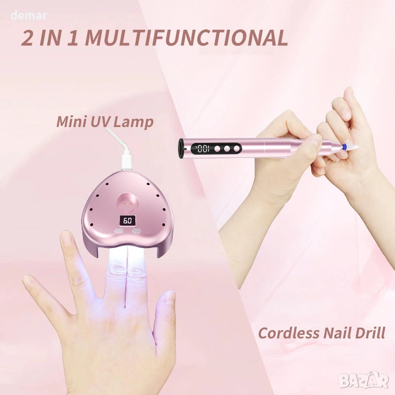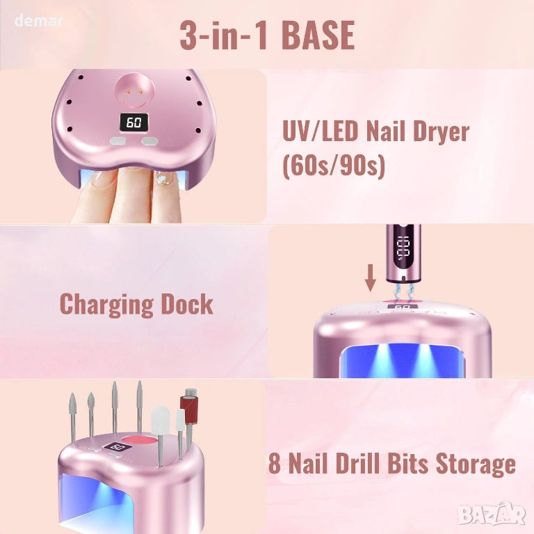 електрическа пила за нокти с UV/LED лампа за втвърдяване и многофункционална зарядна база, която съхранява и често използвани накрайници. Тя поддържа широк спектър от задачи за нокти, включително оформяне, полиране, грижа за кожичките и премахване на гел, акрил и пудра. Пилата предлага множество регулируеми скорости с ясен цифров дисплей, което я прави подходяща както за начинаещи, така и за професионалисти. Акумулаторната батерия осигурява няколко часа употреба, с удобни опции за зареждане с докинг станция или кабел. Проектирана с ниски вибрации, нисък шум и минимално нагряване, тънката и лека конструкция осигурява удобно боравене и я прави идеална както за домашна, така и за салонна употреба.