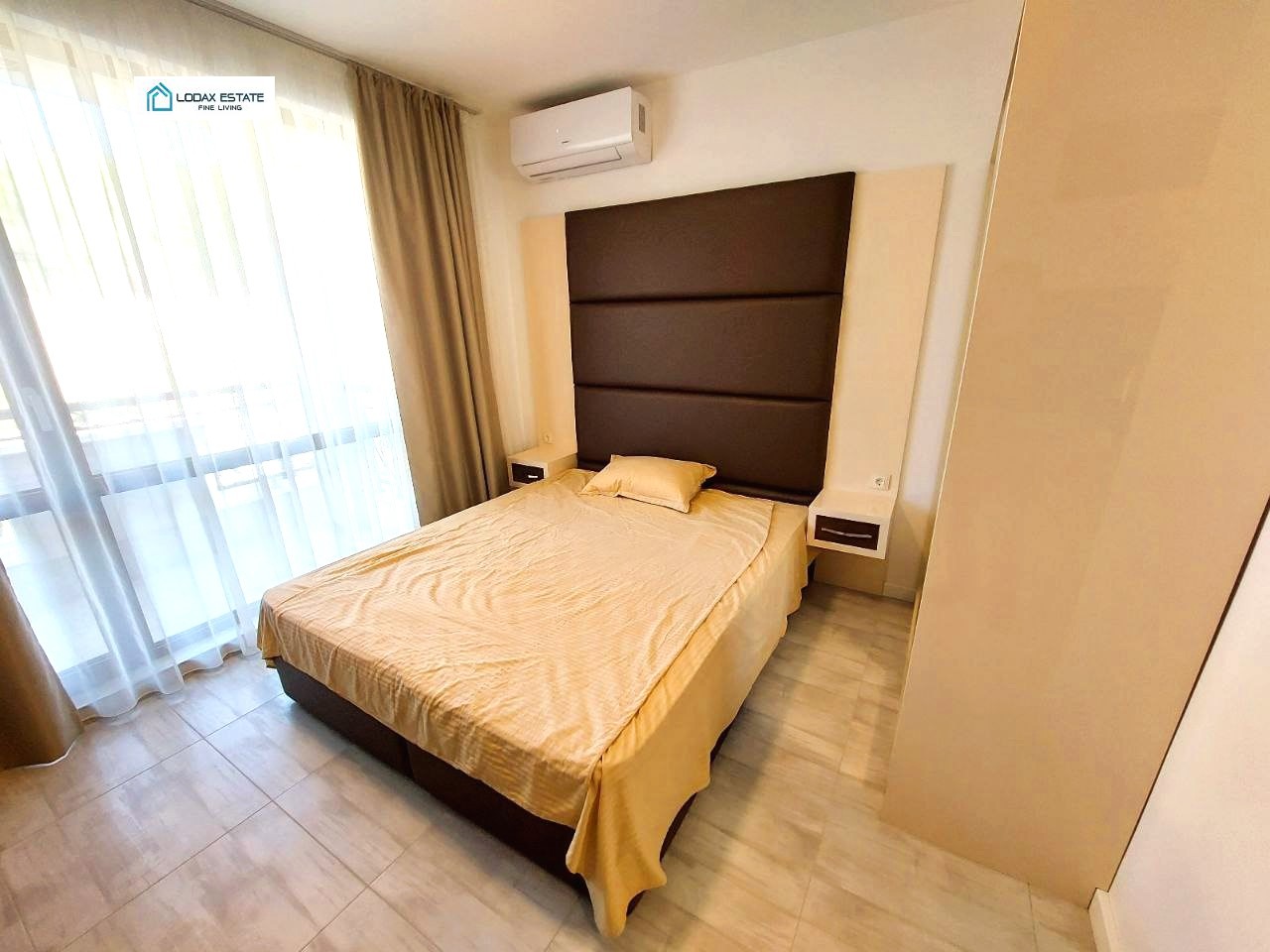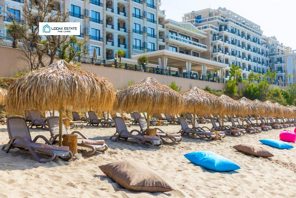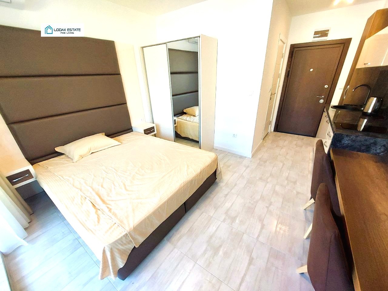 Предлагаме за продажба прекрасен едностаен апартамент на първа линия в най-луксозния комплекс по българското Черноморие/Свети Влас. Студиото се намира на 2-ри етаж и се състои от стая с кухненски бокс, баня и тераса. Продава се напълно обзаведено, с луксозен гранитогрес, санитария, боядисани стени, 1 инверторен климатик, луксозни вътрешни интериорни врати и блиндирани външни врати.
