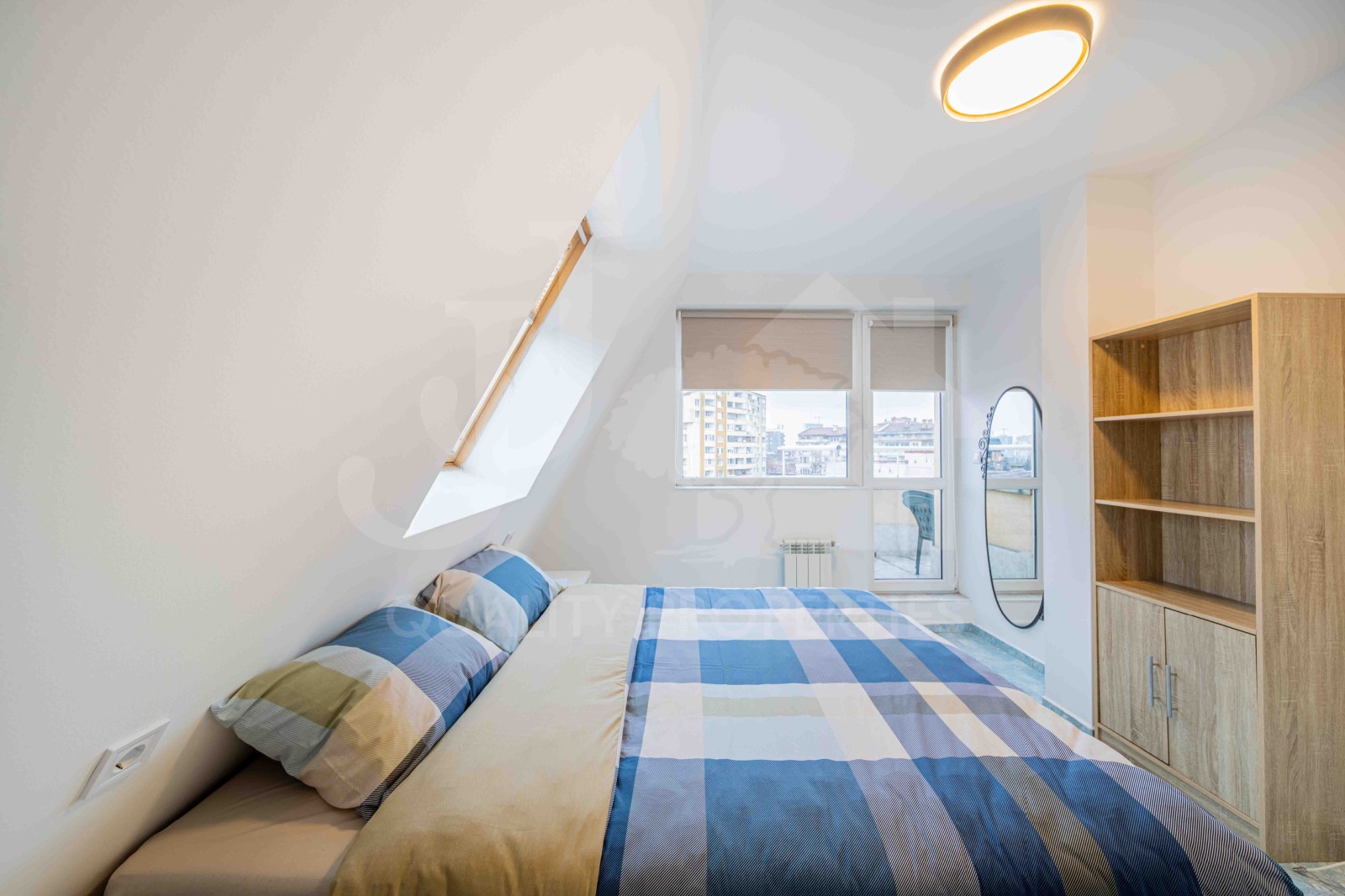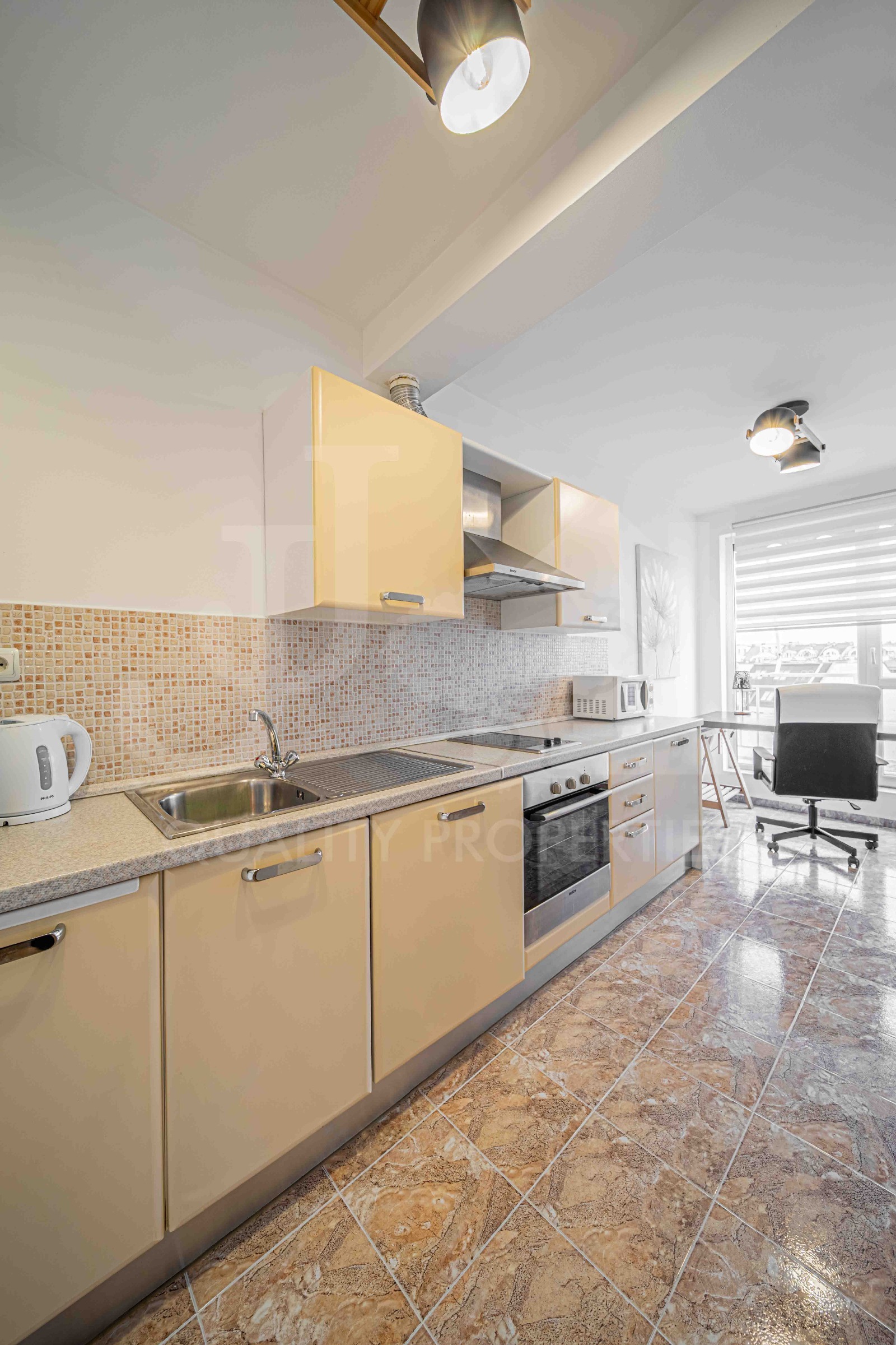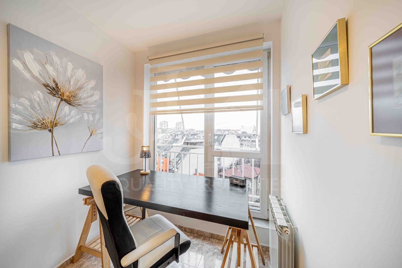 Предлагаме на Вашето внимание изцяло обзаведен двустаен апартамент след ремонт, находящ се на ул. Яков Крайков до ул. Даскал Манол. Районът е много комуникативен- има всякакви магазини, включително Кауфланд, различни заведения, банки, спирки на градски транспорт метростанция на 5-6 мин. пешеходно разстояние и много други. Апартаментът се намира на 6-ти последен етаж, в тухлена сграда с контрол на достъпа с чип, поддържани общи части, контрол на достъпа с чип и асансьор. Жилището е с площ около 86 кв.м. и се състои от: входно антре с допълнителна стая за склад, дневна с трапезарна част и кухненски бокс с всички необходими ел. уреди ( съдомиялна, пералня със сушилня, кафе машина фурна, котлони и т.н.), както и офис кът с хубава гледка, спалня, баня с тоалетна и хубава тераса. Жилището освен с добрата си локация се отличава и с това, че е с много функционално разпределение и е след цялостен освежителен ремонт и голяма част от мебелите и ел. техниката са чисто нови. Отоплението е на ТЕЦ с ниски месечни сметки, като има монтиран и климатик в дневната. Топлата вода е на ТЕЦ, но има и бойлер. Отдава се от физическо лице и не се начислява ДДС върху цената. Не се допускат домашни любимци! Работим с колеги по всички наши оферти! Водещ брокер: Диан Стоянов 0886 08 32 33. Оферта номер: 0218.