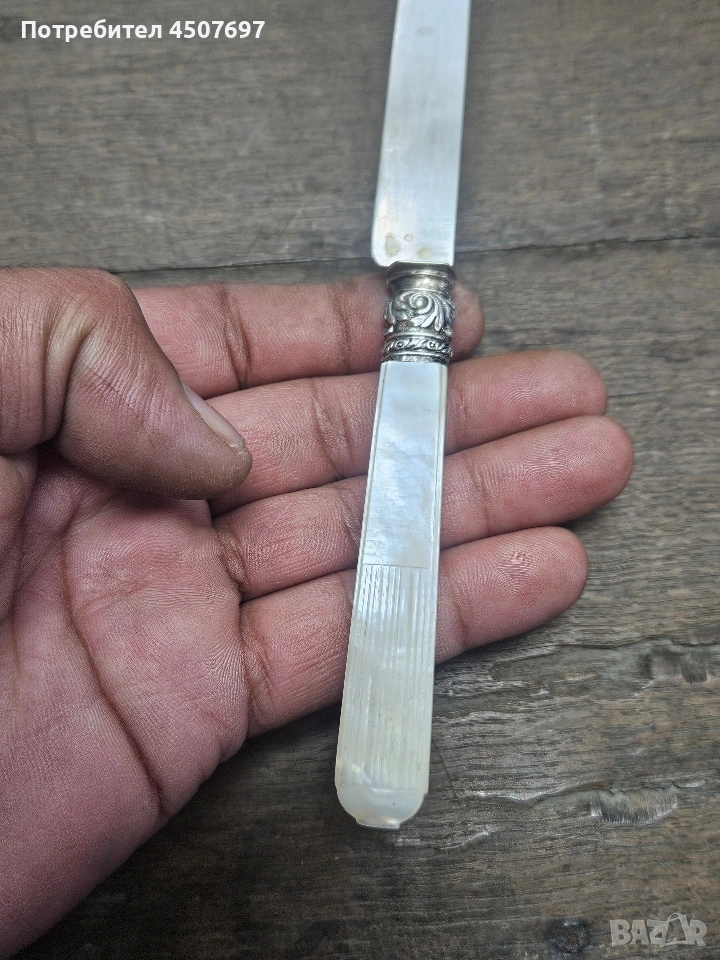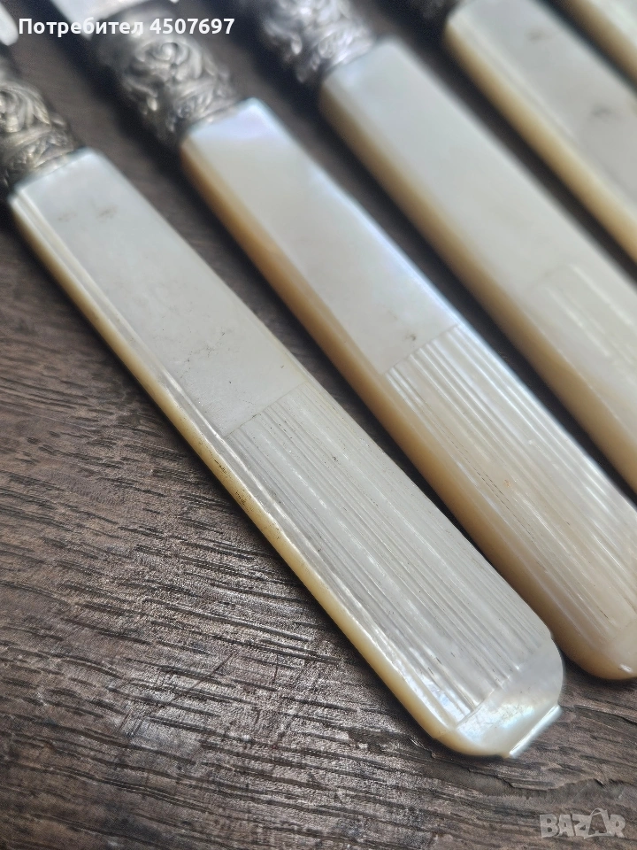 комплект от шест стари сребърни ножа с дръжки от седеф. Дръжките са изработени от седеф, а остриетата са спебърни имат стари печати пачати, най вериатно европейски.