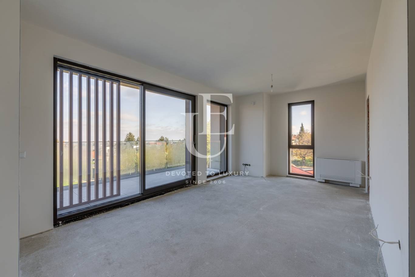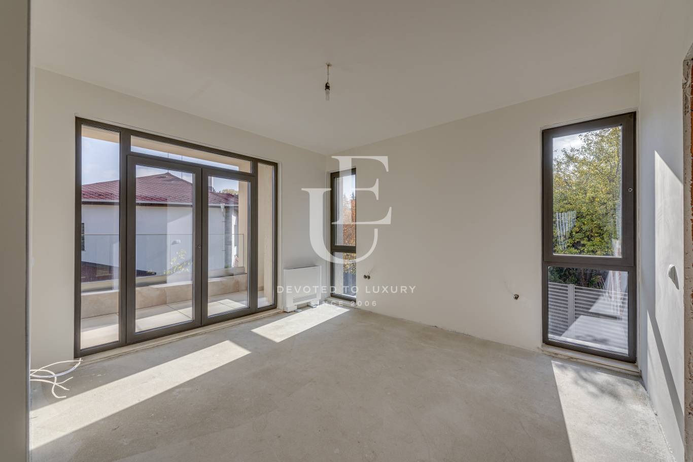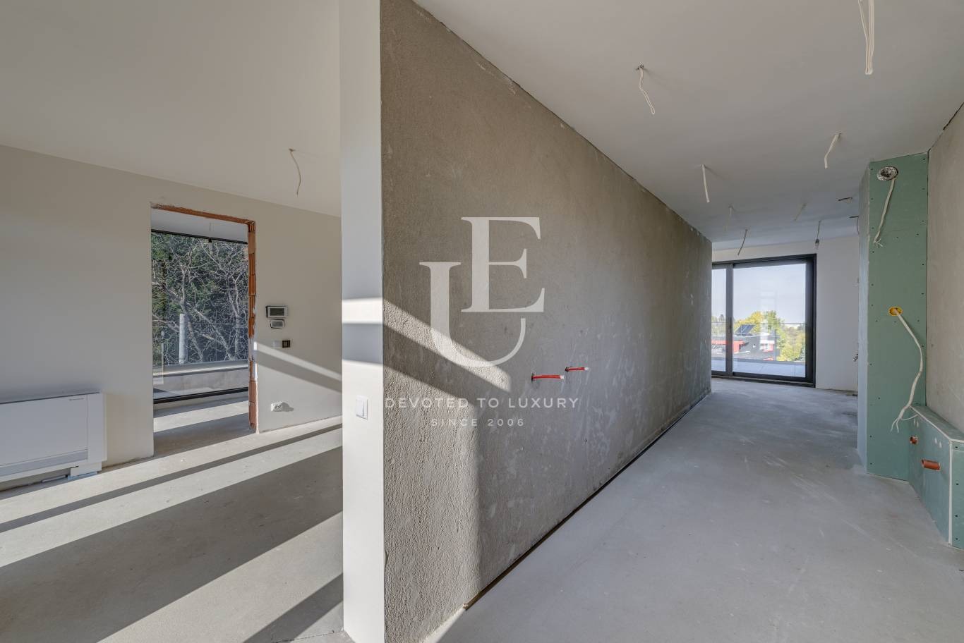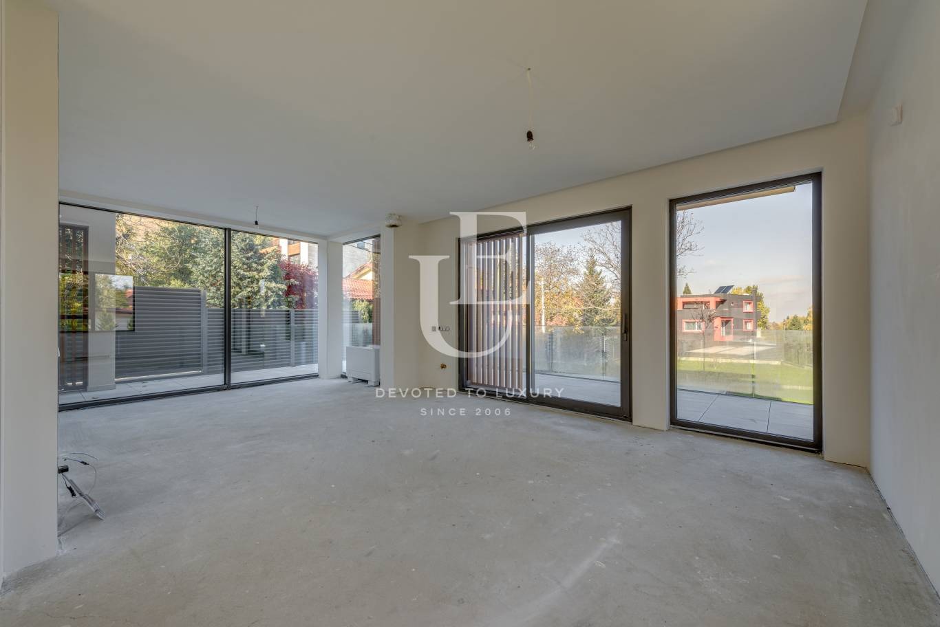 Партерният етаж включва просторен хол с кухненски бокс и трапезария, тоалетна за гости и кабинет с отделна баня. Първият етаж предлага три светли спални с прилежащи бани и дрешници, както и мокро помещение, на втория етаж се намира родителската спалня с дрешник, собствена баня и тераса с красиви гледки. Сутеренът разполага с двоен гараж с лесна за поддръжка настилка, фитнес и сервизно помещение.