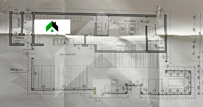 -Основната сграда се състои от общо 100 кв.м. търговска част, от които 60 кв.м. закрита търговска площ + 40 кв.м. зимна градина. В останалата квадратура са разпределени, предверие, кухня, битовка, подготвително помещение, бар, санитарни възли и други помощни помещения.