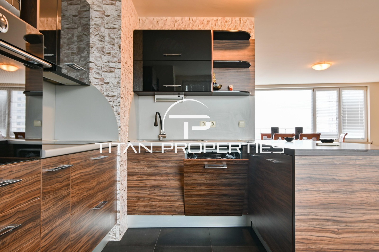 Просторният хол с кухненски бокс е комбиниран със стилно обзавеждане, а трите спални и двете бани с тоалетна предлагат уединение и комфорт. Две тераси разкриват панорамни гледки към града.