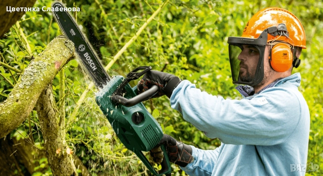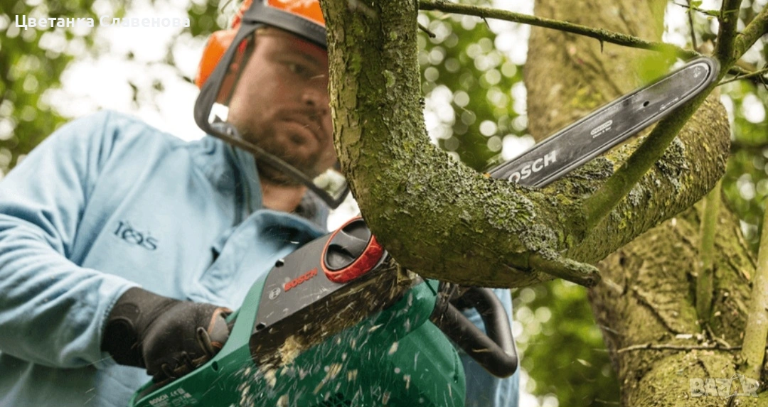 Електрическият трион BOSCH UniversalChain 35 притежава мощен 1800 W-ов мотор и скорост на веригата 12 m/s, с което се постига бързо рязане. Смяната на веригата на резачката е изключително лесна, без нужда от инструмент, благодарение на SDS система. Резервоарът за масло е странично поставен, с добра видимост и удобна капачка за доливане. Електрическата резачка е подходяща за рязане на клони, дърва за огрев или трупи