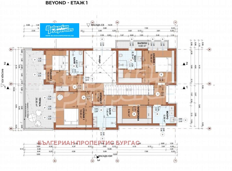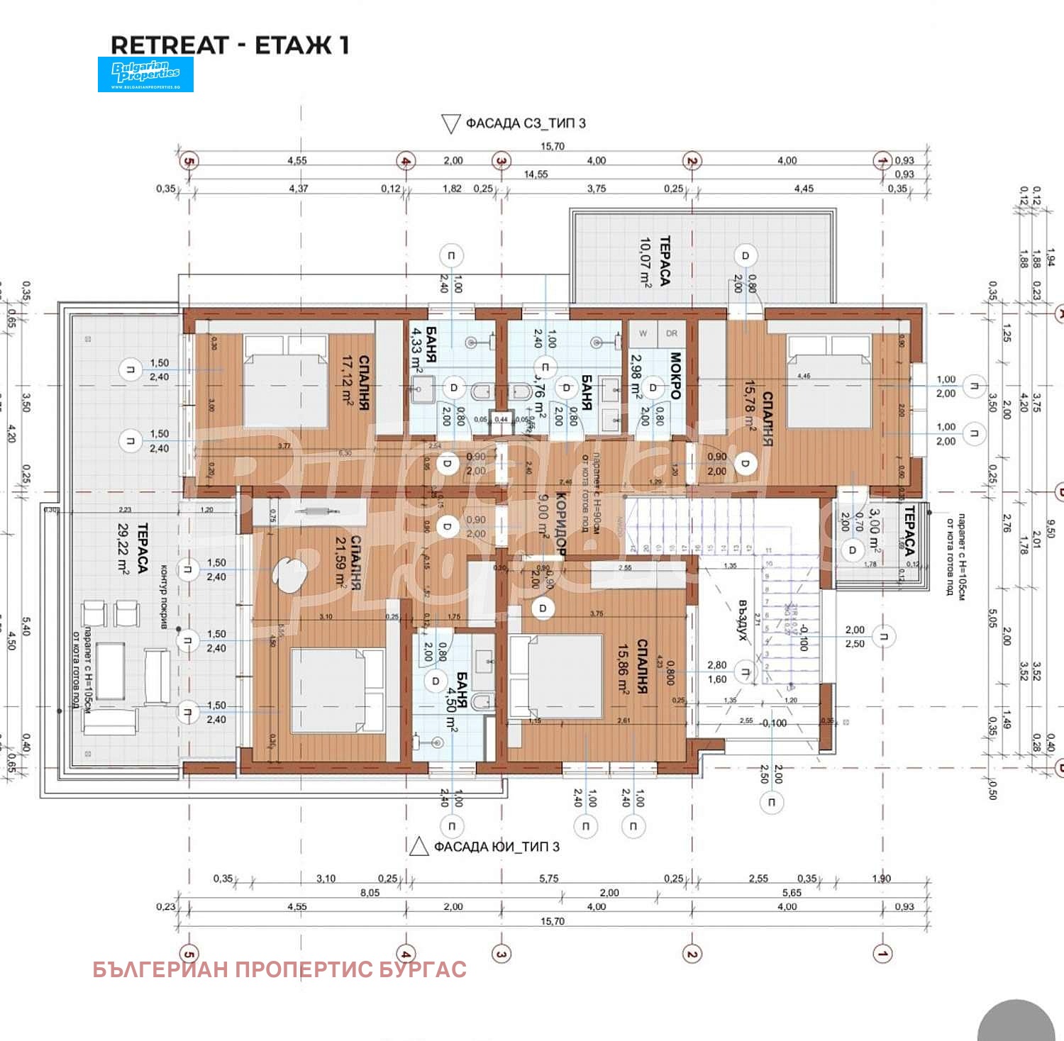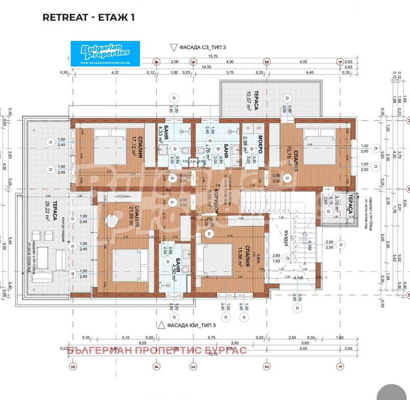 Три големи спални, всяка със самостоятелна баня и тераса