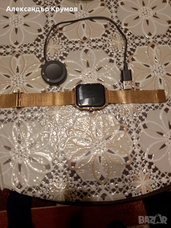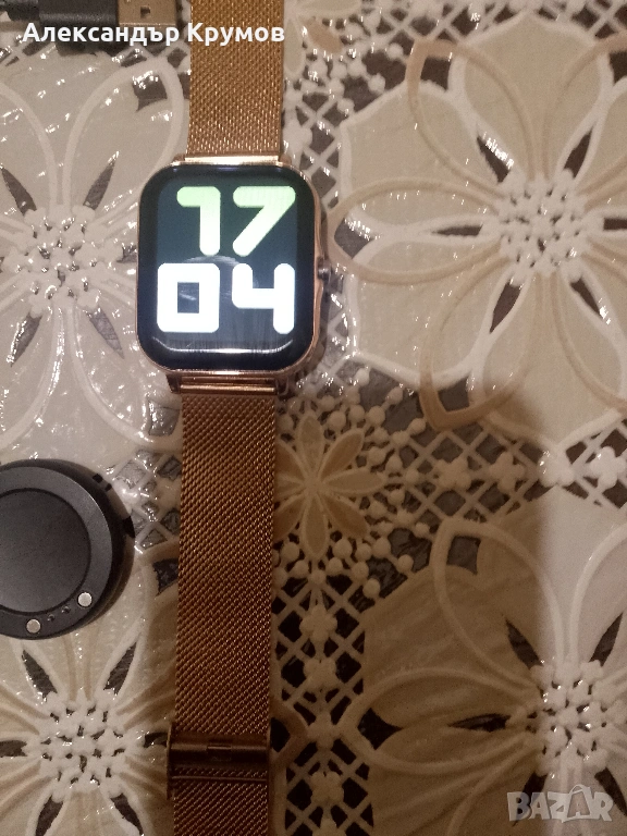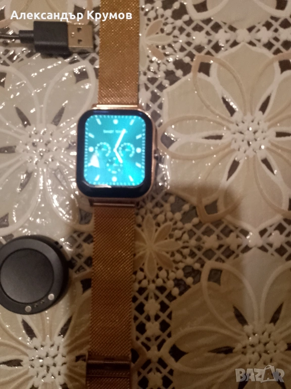 Продавам смарт часовник с много функции. Мери кръвно, пулс, кислород и много други функции, крачкомер. Различни стилове на екрана и функциите. Може да се свързва с телефон и да се набират номера с провеждане на разговори от него. Има слот за карта памет. Верижка от неръждаема медицинска стомана в приятен цвят. Като нов, без следи от употреба. Батерията издържа около 1 седмица при нормална експлоатация. Магнитен заряден кабел за лесен достъп.