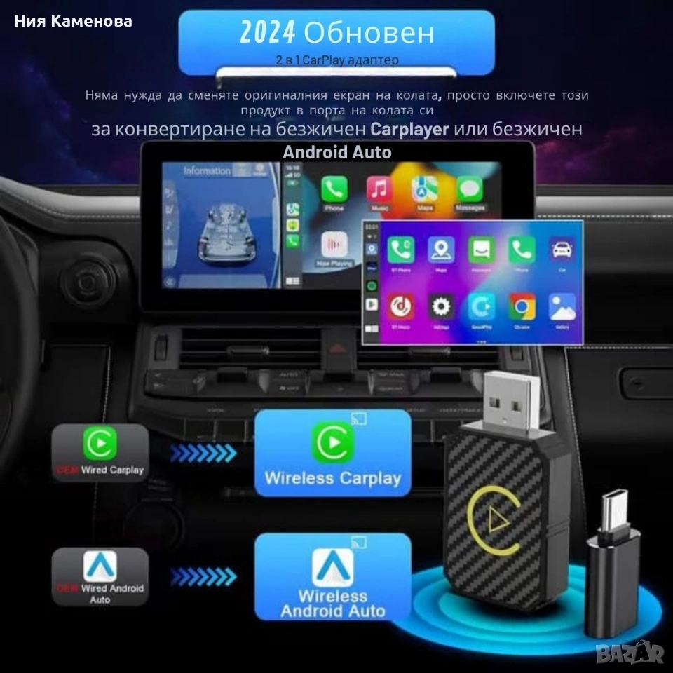Безжичен адаптер за CarPlay и Android Auto–Plug & Play,Bluetooth 5.0,двулентовWi-Fi 2.4/5GHz → Обява 53023435