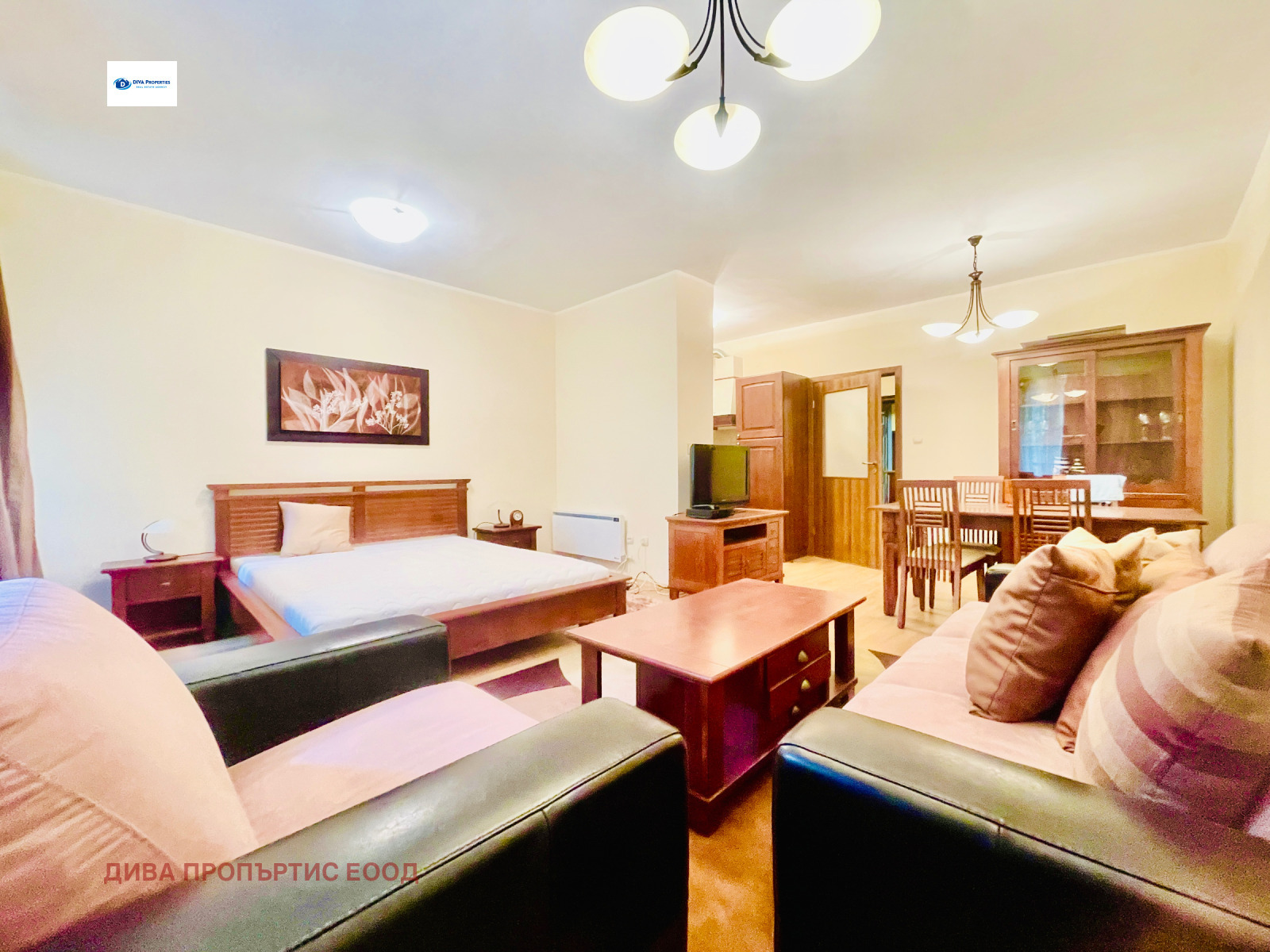 Разпределение: антре, гардеробна, санитарен възел, кухненски бокс, трапезария, спален кът и дневна зона с мека мебел.