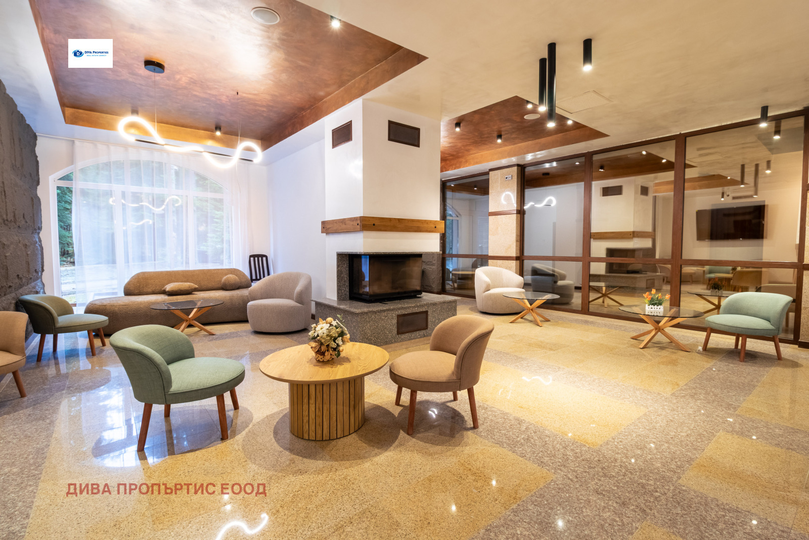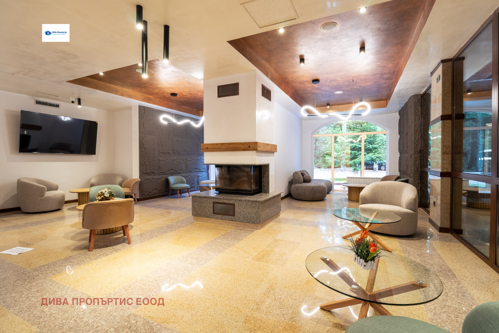 Луксозно лоби бар с камина за допълнителен уюут.