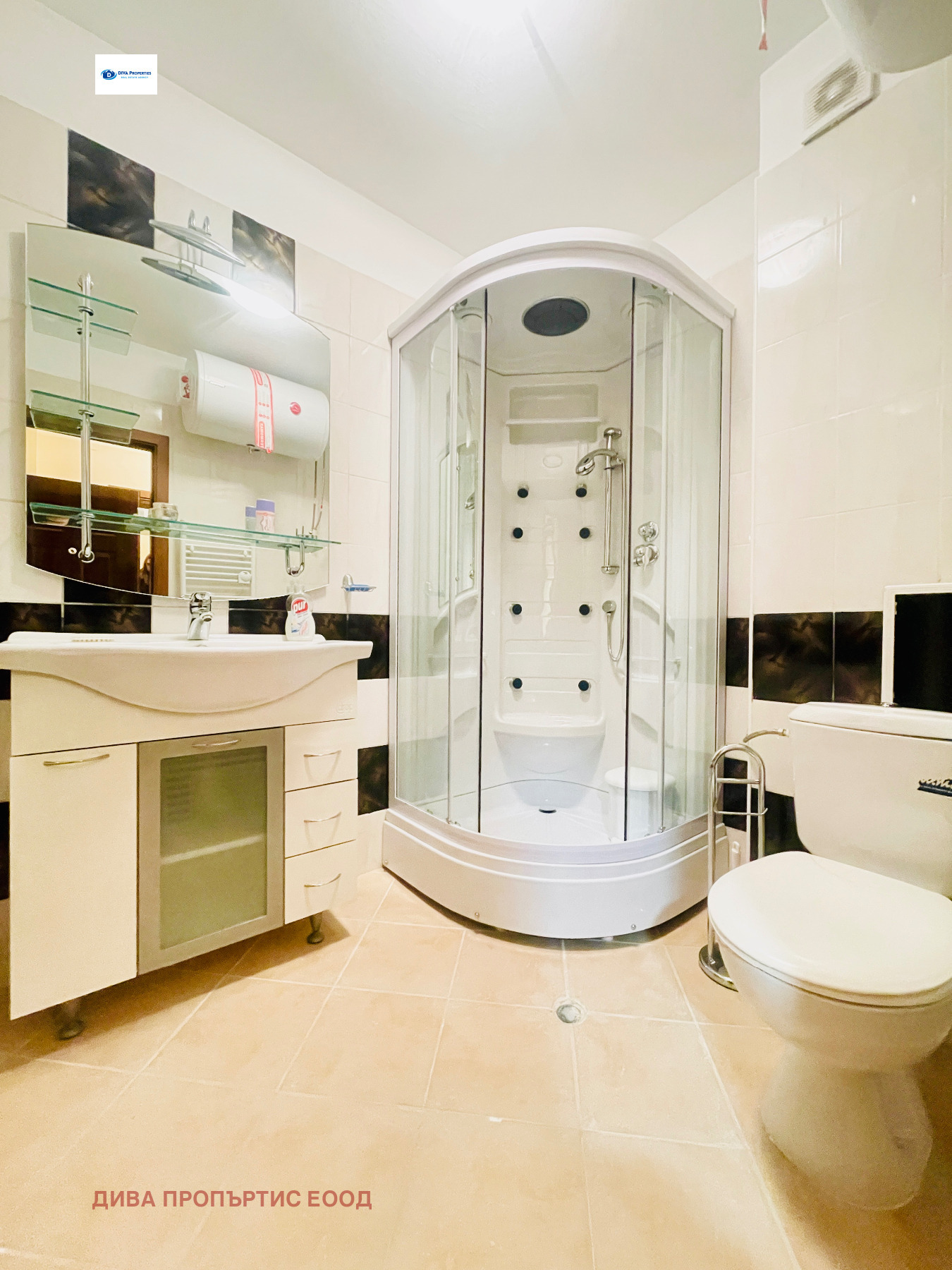 Сградата е поддържана. Има асаньор, охрана и постоянно видеонаблюдение. Апартаментът е напълно обзаведен и разполага с уютна дневна зона с мека мебел и маса за хранене. Кухненският бокс е оборудван с необходимото за ежедневни нужди. Санитарен възел с душ-кабина.