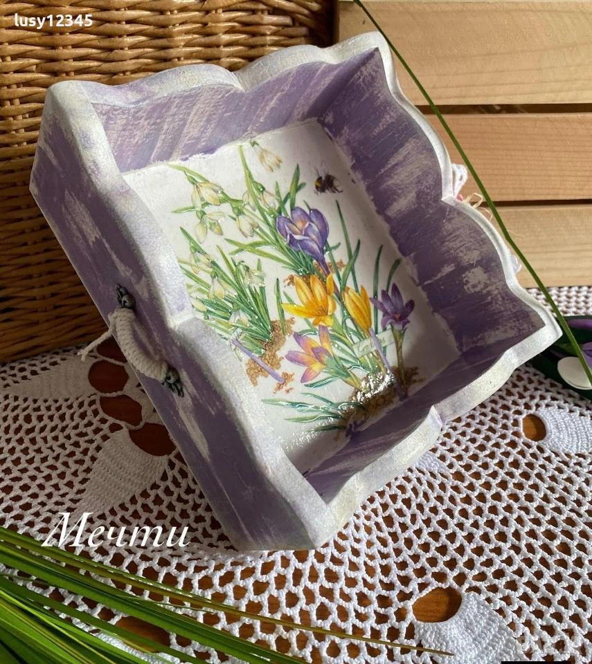 Панерче от липа декорирано с декупаж, метални елементи, канап, дантела и отново много любими капки дъжд.