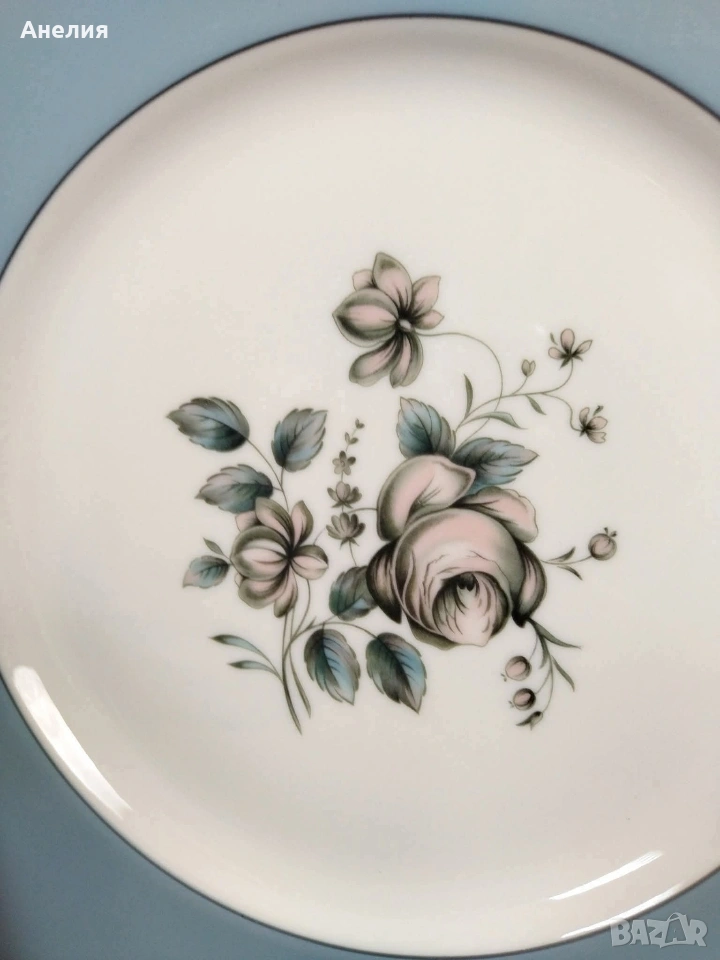 Костен порцелан. Синя/сив бордюр ,тъмно розова роза и златен кант. Няма чипове, наранявания, надрасквания и повреди по цветния декор. Само на 4 чинии посочени на снимките.