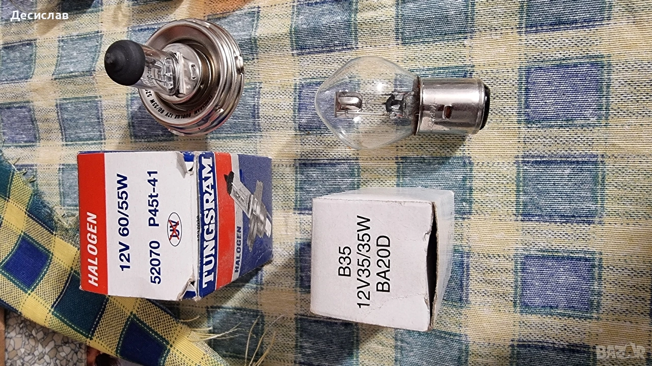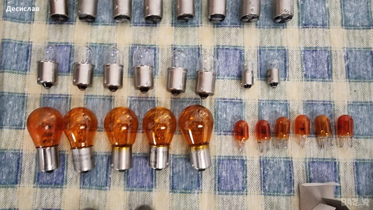 Различни видове крушки за автомобили нови и използвани 12v/21w-11бр. нови 12v/21/5w-8бр.нови 12v/5w-6бр.нови vs 4,8v/1,5w-1бр.нова Vs 4v/1,1w 1бр.нова Оранжеви 12v/21w-4бр.с несиметрични пъпки-нови 12v/5wцокъл-6бр.нови 12v/21/5w-2бр.използвани за японски коли със цоклите 12v/16w-2бр.за японски коли-нови 1бр. 5,5v/5,5w нова Халогенни крушки 12v/60/55wTungsram-1бр.нова 12v/55w H3 1бр.ползвана 12v/35/35w-нова за мотор.ВА20D H7 2бр.Osram 12v/55w нови 2бр.Немски 12v/55w,малко ползвани. Посочената в обявата цена е за всичките,може и на бройка,цена по договаряне!!!