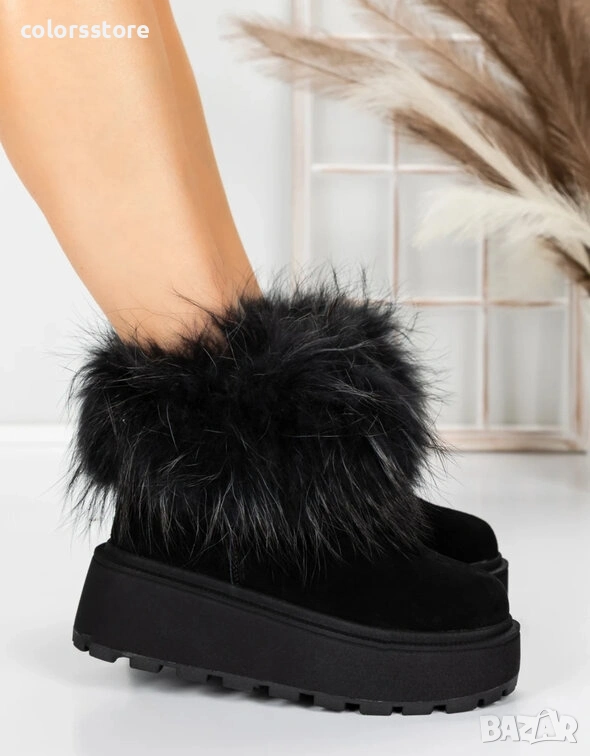 Боти на платформа - черен ЕСТЕСТВЕН велур с черен ЕСТЕСТВЕН косъм - 3ASJN73