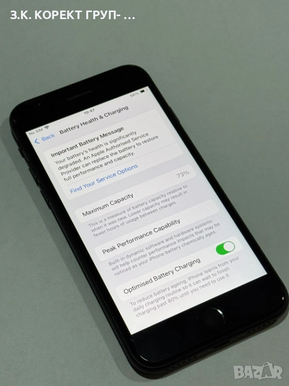 Продавам iPhone SE второ поколение с вътрешна памет от 64GB и батерия със здраве от 73%. Устройството е в прилично състояние и функционира без проблеми. Състояние:
