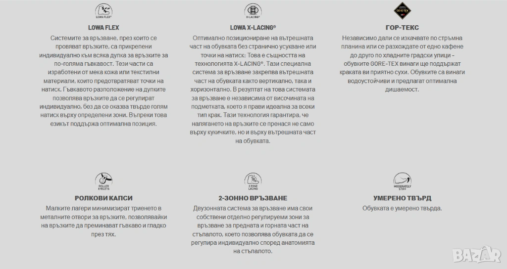 • LOWA X връзване – Специална система за връзване фиксира езика както вертикално, така и хоризонтално. Оптимално позициониране без подхлъзване или точки на натиск.
