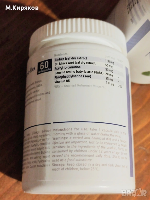 Сух екстракт от листа на гинко (Ginkgo biloba); желатин (съставка на обвивката на капсулата); сух екстракт от листа на жълт кантарион (Hypericum perforatum); ацетил-L-карнитин хидрохлорид; гама-аминомаслена киселина (GABA); фосфатидилсерин (соя); малтодекстрин; магнезиеви соли на мастни киселини (противослепващ агент); пиридоксин хидрохлорид; оцветител медни комплекси на хлорофилини.