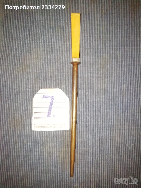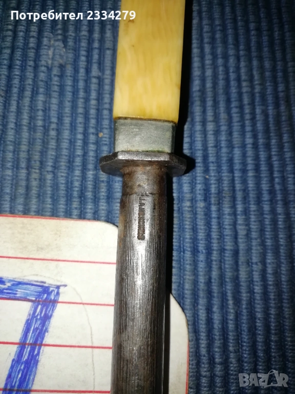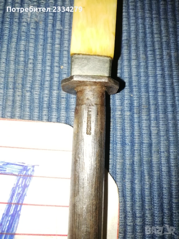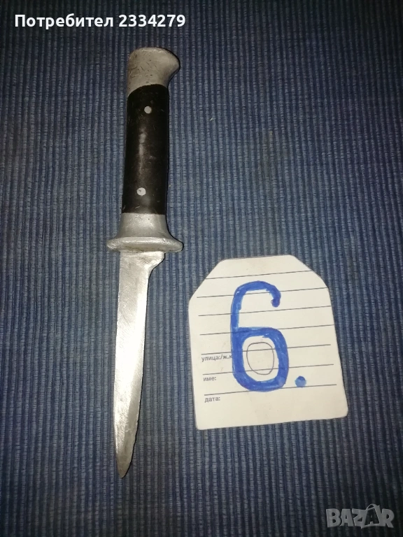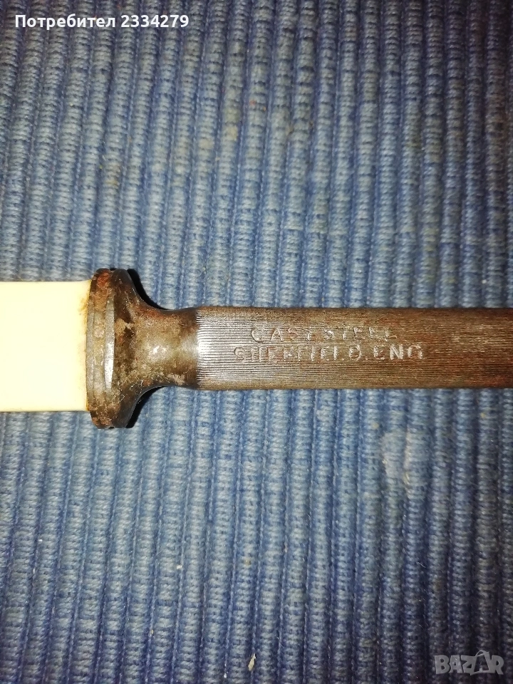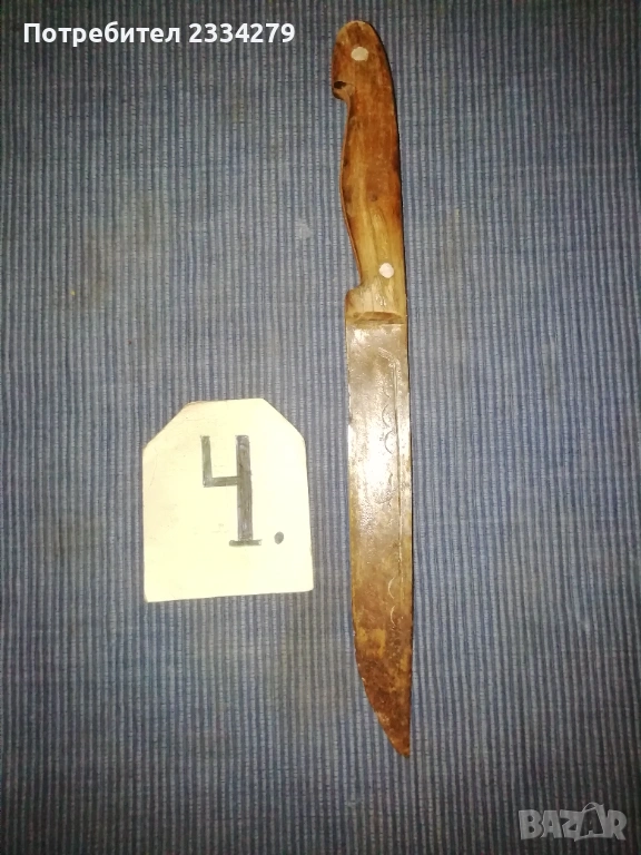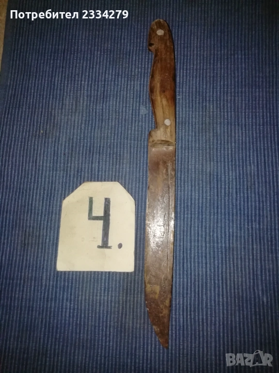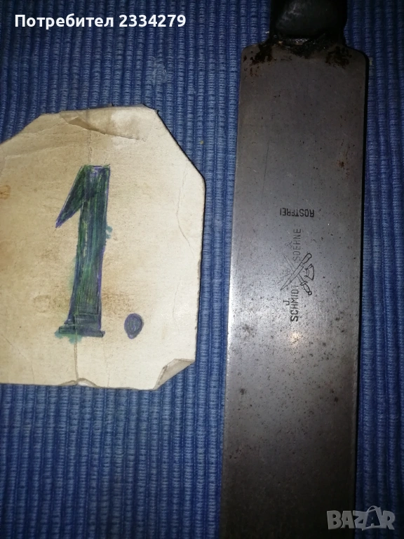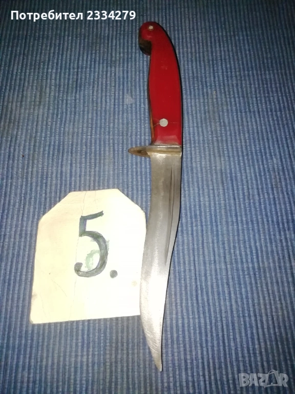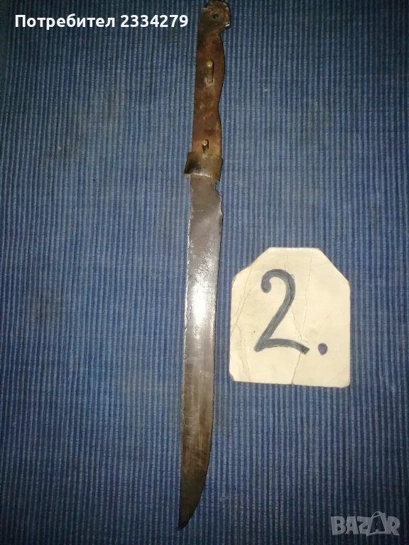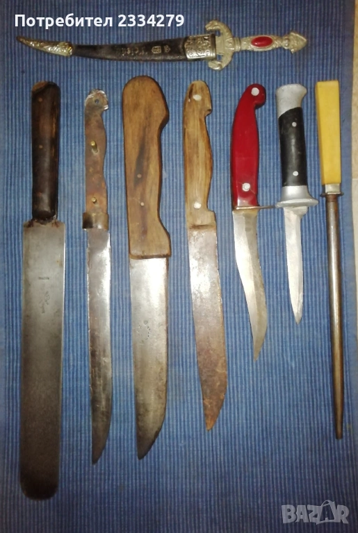 ножове различни изработки в различни години от различни майстори. N:1колекционерски нож ,,SCHMIDT SOEHNE ROSTREI" използван през 30-40 в сладкарсво, млечна и пчеларската индустрия, размери 23х3.5см., цена 13€.; N:2 стар автентичен овчарски нож,каракулак,ръчно изкован и орнаментиран от едната страна, размери на острието 20х2см., дебелина 3мм.,цял размер 33см., цена 10€.; N:3 (НЕНАЛИЧЕН) ; N:4 ръчно кован орнаментиран автентичен нож, овчарски-касапски нож с цяла дължина 30см., острие 17х2.5см., дебелина 3мм., цена 10€.; N:5 стар ловджийски ръчно изработен нож, размери на острието 13х2см., дебелина 2мм., цял размер 23см., цена 10€.; N:6 стар български нож, изработка от 60-години,размер на острие 10х1.5см., дебелина 2мм., цена 3€.; N:7 стар масат, точило за режещи предмети със щемпъл ,, J.A.HENCHELS" метал и костена дръжка, 1940-50год., цена 10€.; N:8 стар много добре запазен масап от 40-50те години, произведен в Англия с надпис ,,CAST STEEL SHEFFIELD. ENGLAND", цена 10€.