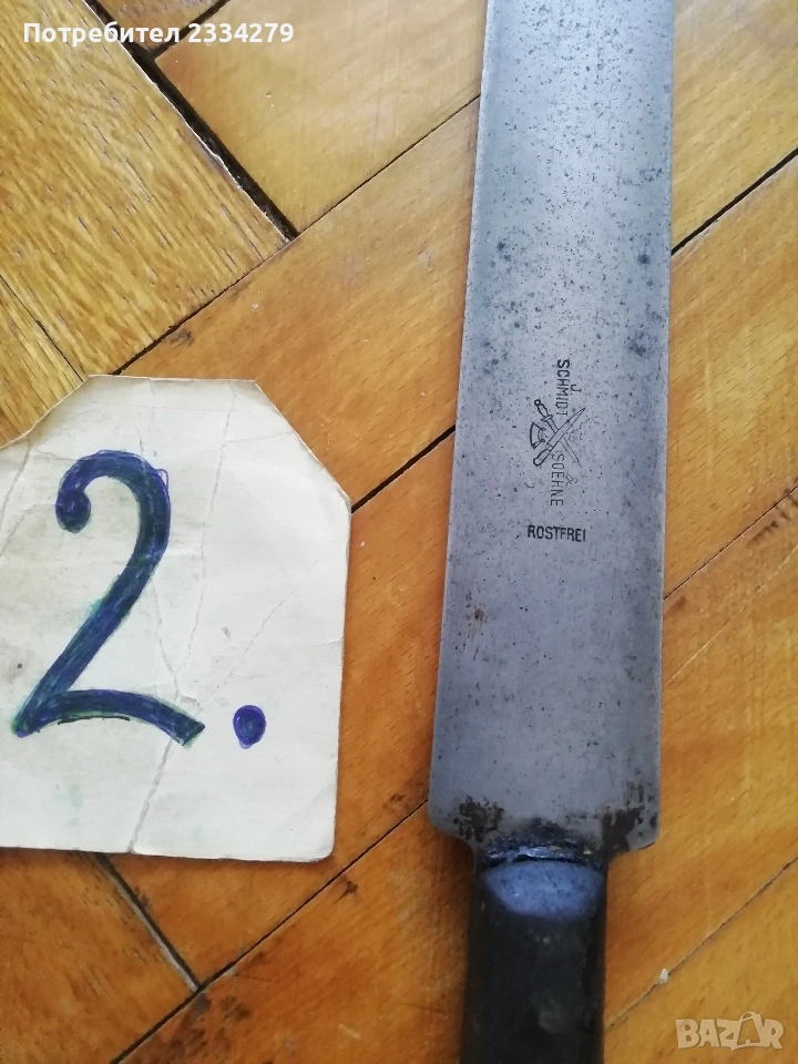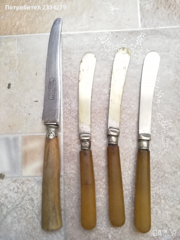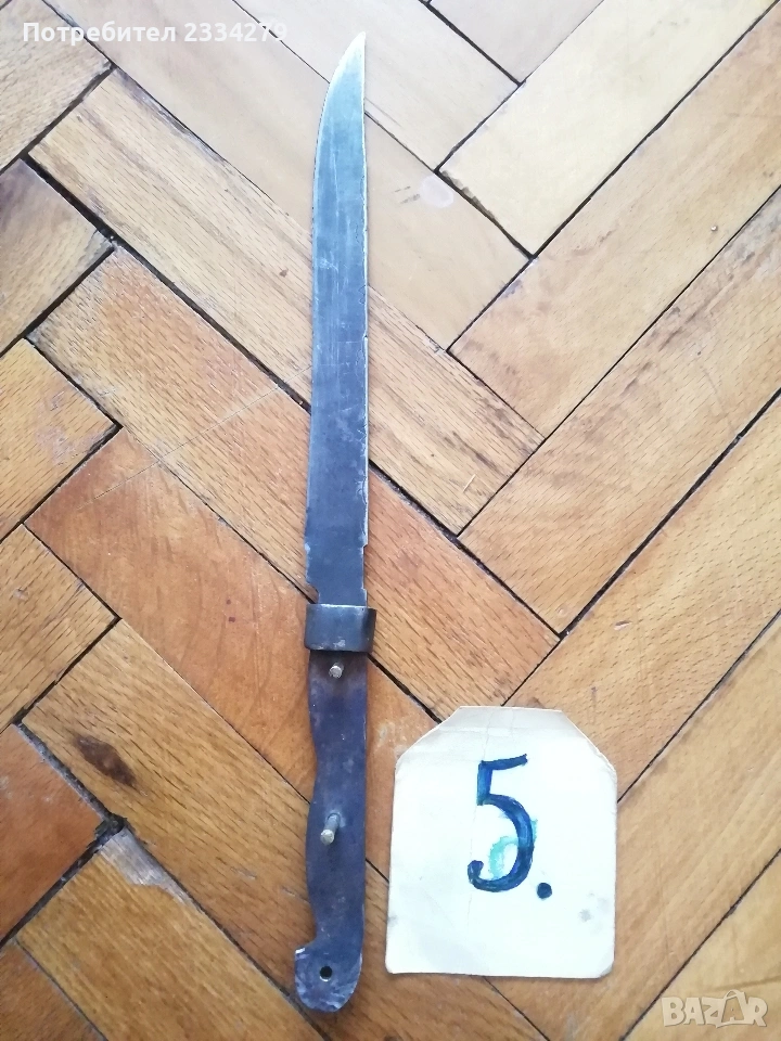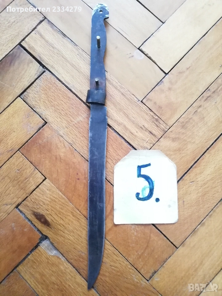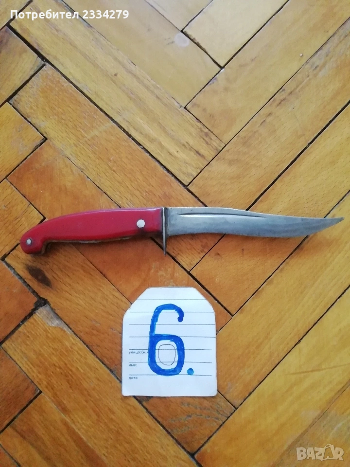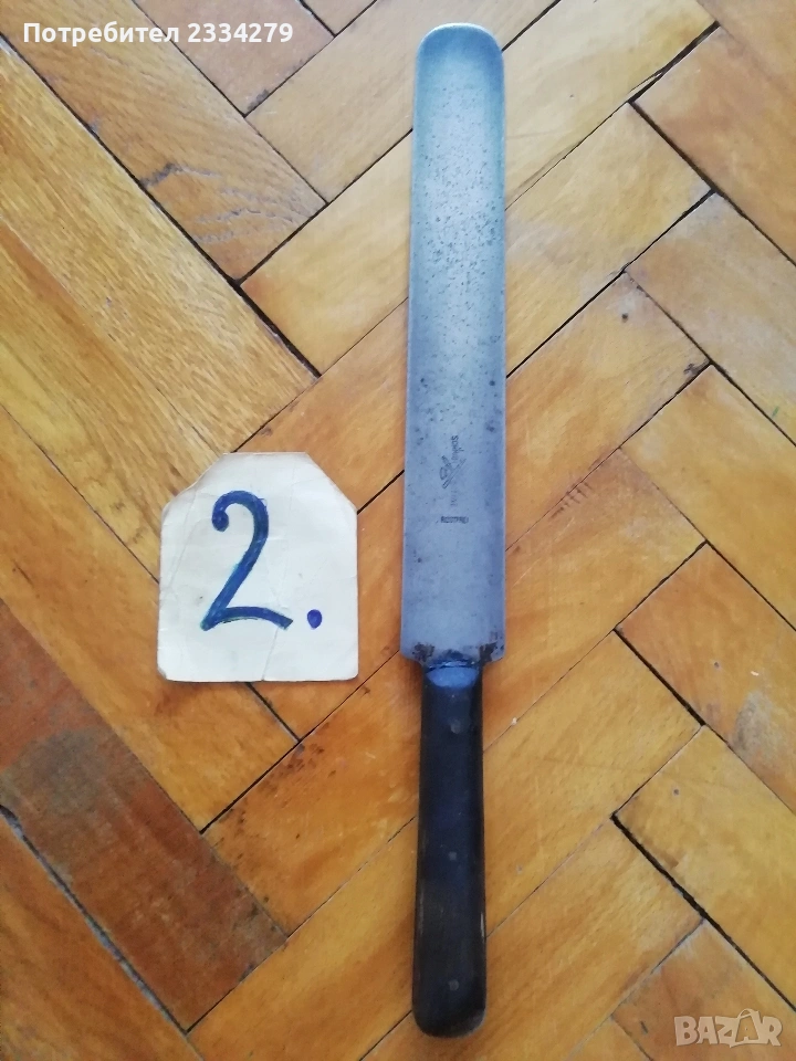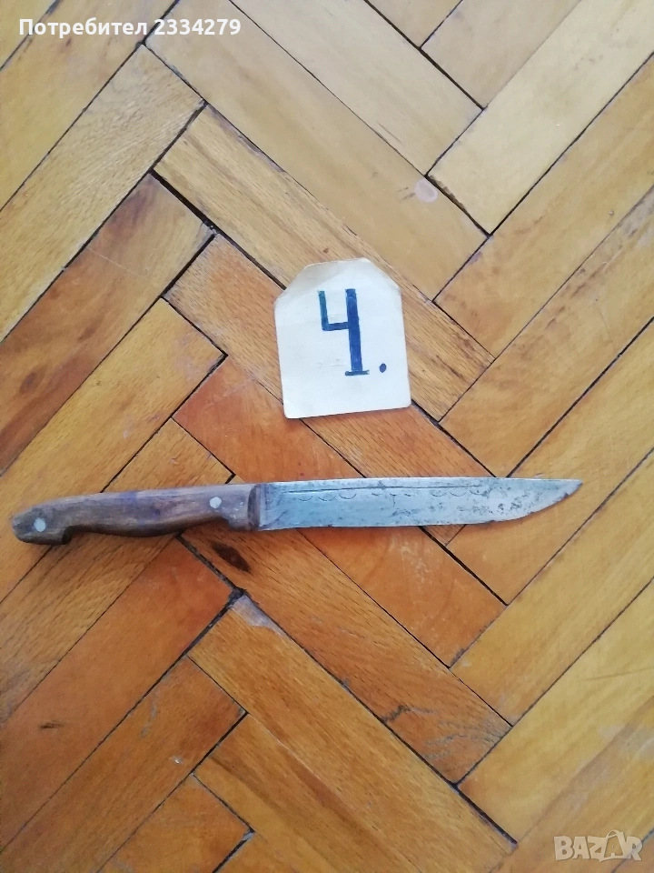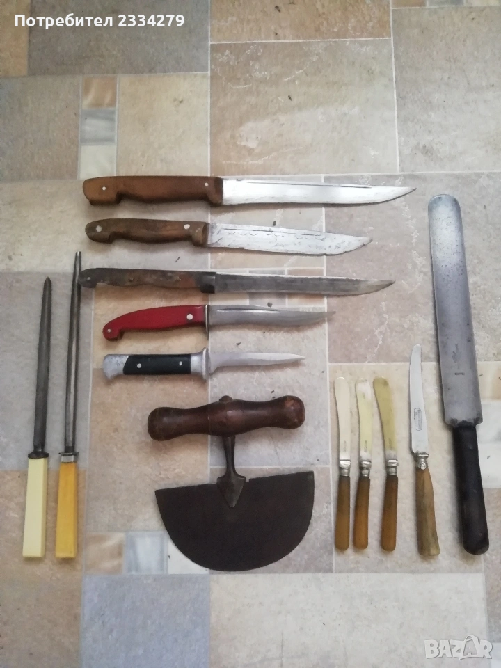 ножове различни изработки в различни години от различни майстори. N:1стар нож със заоблени острие, сарашки занаядчийси нож за рязане на дебели кожи. Този вид нож е на инуитите наречен,,улу" за дране има маркиран надпис ,,STEEL"предполага се от началото ХХ век, размери 17х16см., цена 30€.; N:2 колекционерски нож ,,SCHMIDT SOEHNE ROSTREI" използван през 30-40 в сладкарсво, млечна и пчеларската индустрия, размери 23х3.5см., цена 13€.; N:3 стар автентичен овчарски нож,каракулак,ръчно изкован от едната страна има канал, размери на острието 20х2.5см., дебелина 3мм.,цял размер 33см., цена 15€.; N:4 стар ръчно изкован нож тип колак, овчарски нож, масивен с наковани орнаменти и канал, размери на острието 17х2.5см., дебелина 3мм., цял размер 34см., цена 15€.; N:5 ръчно кован орнаментиран автентичен нож, овчарски-касапски нож с цяла дължина 32см., острие 19х2см., дебелина 3мм.,(няма дръжка) цена 10€.; N:6 стар ловджийски ръчно изработен нож от 50-60години, размери на острието 13х2см., дебелина 2мм., цял размер 23см., цена 10€.; N:7 стар български нож тип кама, аломиниева дръжка с черно и глава на птица, цена 3€.; N:8 стар масат, точило за режещи предмети със щемпъл ,, J.A.HENCHELS" метал и костена дръжка, 1940-50год., цена 10€.; N:8 стар много добре запазен масап от 40-50те години, произведен в Англия с надпис ,,CAST STEEL SHEFFIELD. ENGLAND", цена 10€.