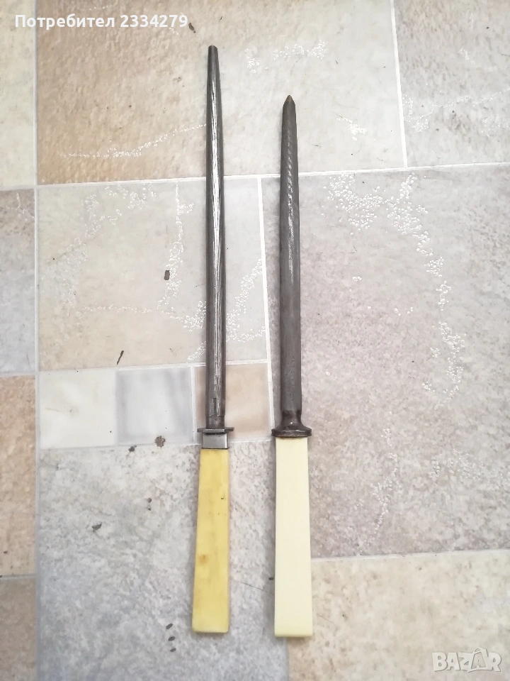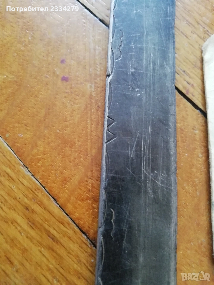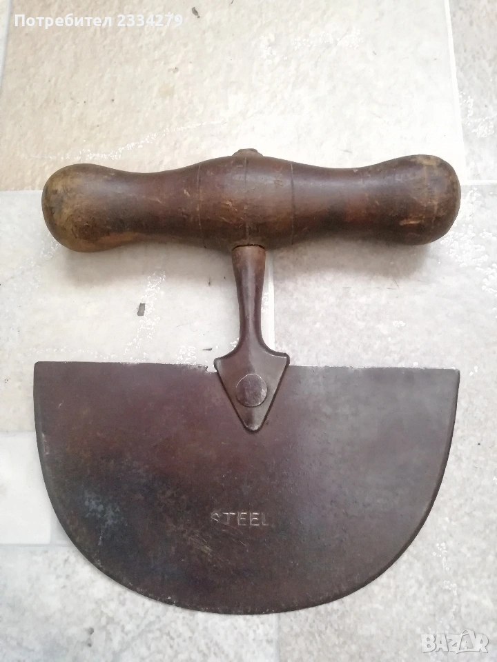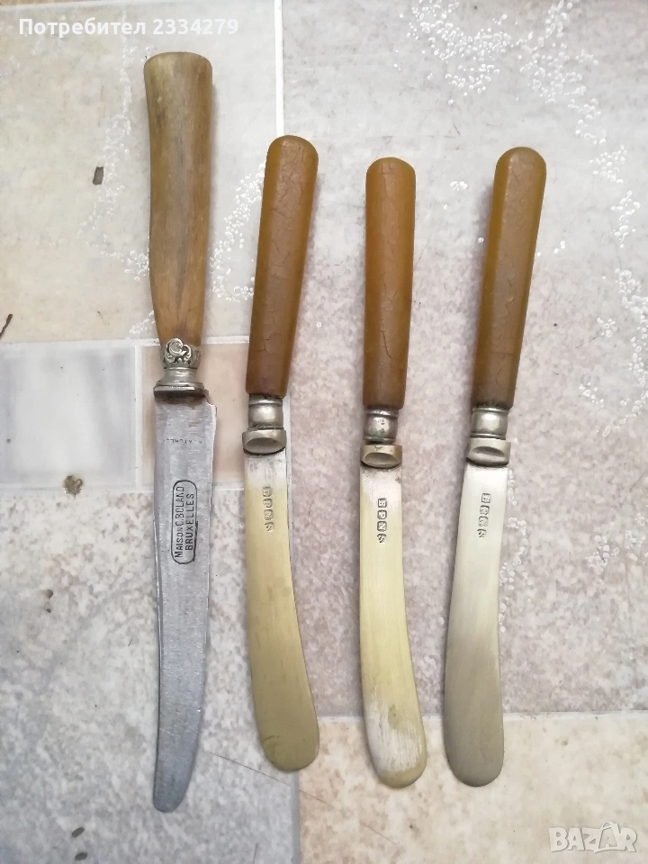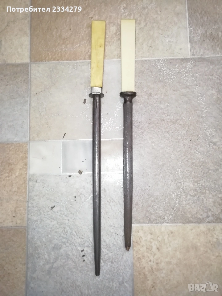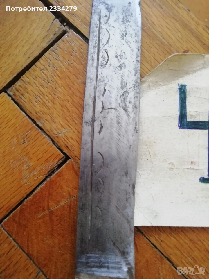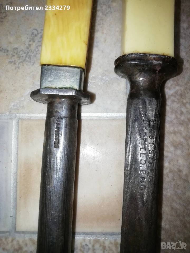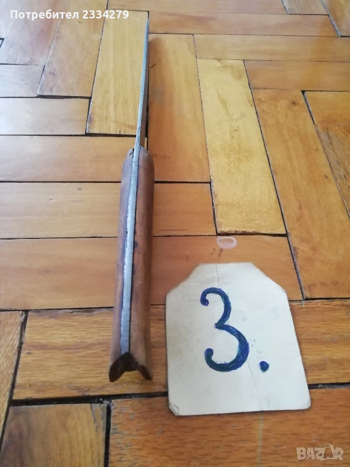 ножове различни изработки в различни години от различни майстори. N:1стар нож със заоблени острие, сарашки занаядчийси нож за рязане на дебели кожи. Този вид нож е на инуитите наречен,,улу" за дране има маркиран надпис ,,STEEL"предполага се от началото ХХ век, размери 17х16см., цена 30€.; N:2 колекционерски нож ,,SCHMIDT SOEHNE ROSTREI" използван през 30-40 в сладкарсво, млечна и пчеларската индустрия, размери 23х3.5см., цена 13€.; N:3 стар автентичен овчарски нож,каракулак,ръчно изкован от едната страна има канал, размери на острието 20х2.5см., дебелина 3мм.,цял размер 33см., цена 15€.; N:4 стар ръчно изкован нож тип колак, овчарски нож, масивен с наковани орнаменти и канал, размери на острието 17х2.5см., дебелина 3мм., цял размер 34см., цена 15€.; N:5 ръчно кован орнаментиран автентичен нож, овчарски-касапски нож с цяла дължина 32см., острие 19х2см., дебелина 3мм.,(няма дръжка) цена 10€.; N:6 стар ловджийски ръчно изработен нож от 50-60години, размери на острието 13х2см., дебелина 2мм., цял размер 23см., цена 10€.; N:7 стар български нож тип кама, аломиниева дръжка с черно и глава на птица, цена 3€.; N:8 стар масат, точило за режещи предмети със щемпъл ,, J.A.HENCHELS" метал и костена дръжка, 1940-50год., цена 10€.; N:8 стар много добре запазен масап от 40-50те години, произведен в Англия с надпис ,,CAST STEEL SHEFFIELD. ENGLAND", цена 10€.