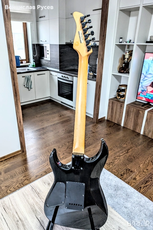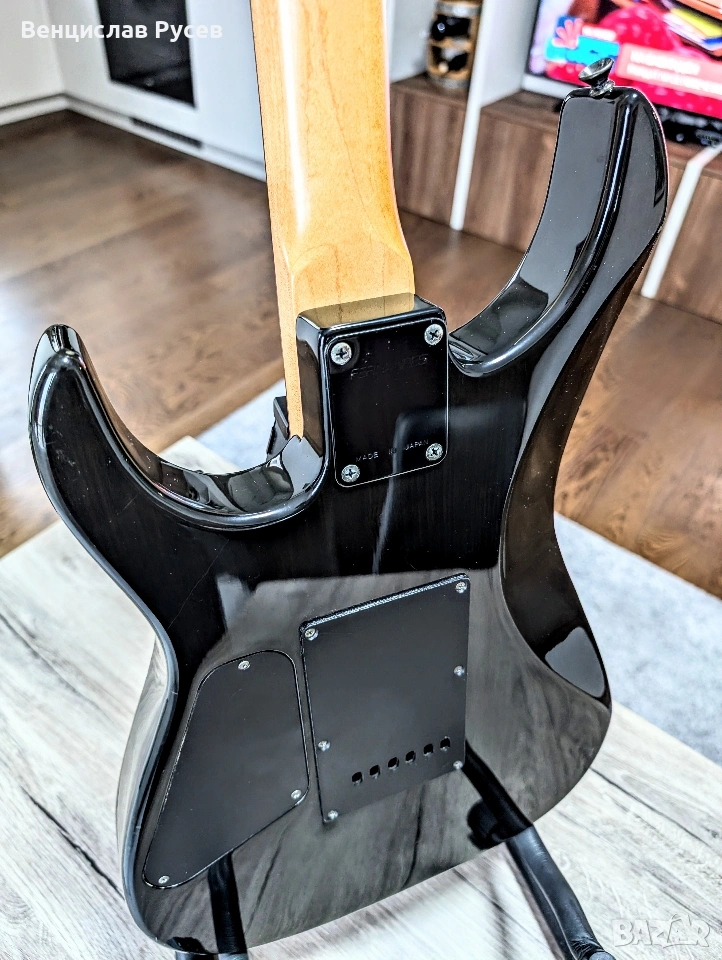 Китарата е произведена 2005 г. в Япония. Bolt-On конструкция, Alder тяло с Flamed Maple Top, 1 piece Maple гриф с Rosewood фингърборд, 24 прагчета, 25.5" мензура, двуточково тремоло, 5 way switch, 1 volume, 1 tone. Адаптерите са VS-500B на бридж позиция, VS-500 на нек и мидъл, в конфигурация H/S/S. Инструментът е в отлично състояние, с нови струни 9-42 и професионален сетъп с нисък екшън. Предпочитам преглед и тест, но мога да я изпратя и с Еконт, добре опакована.