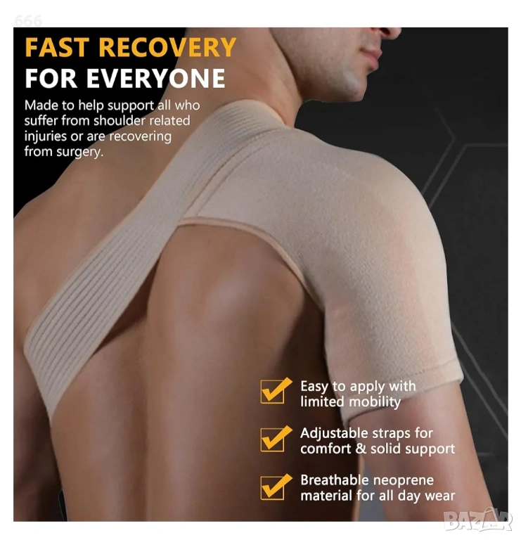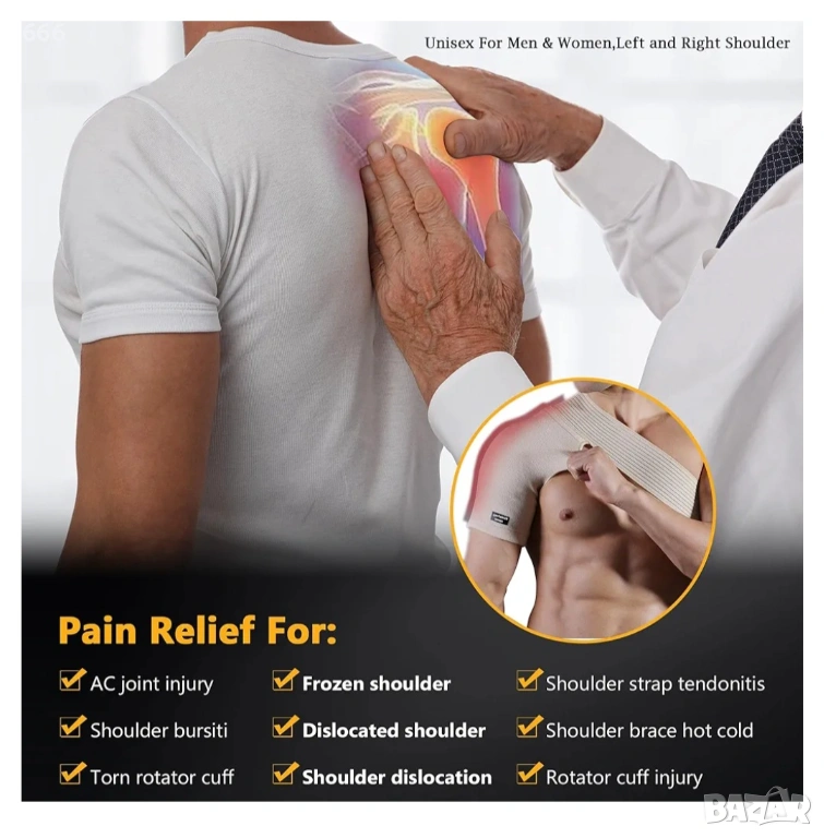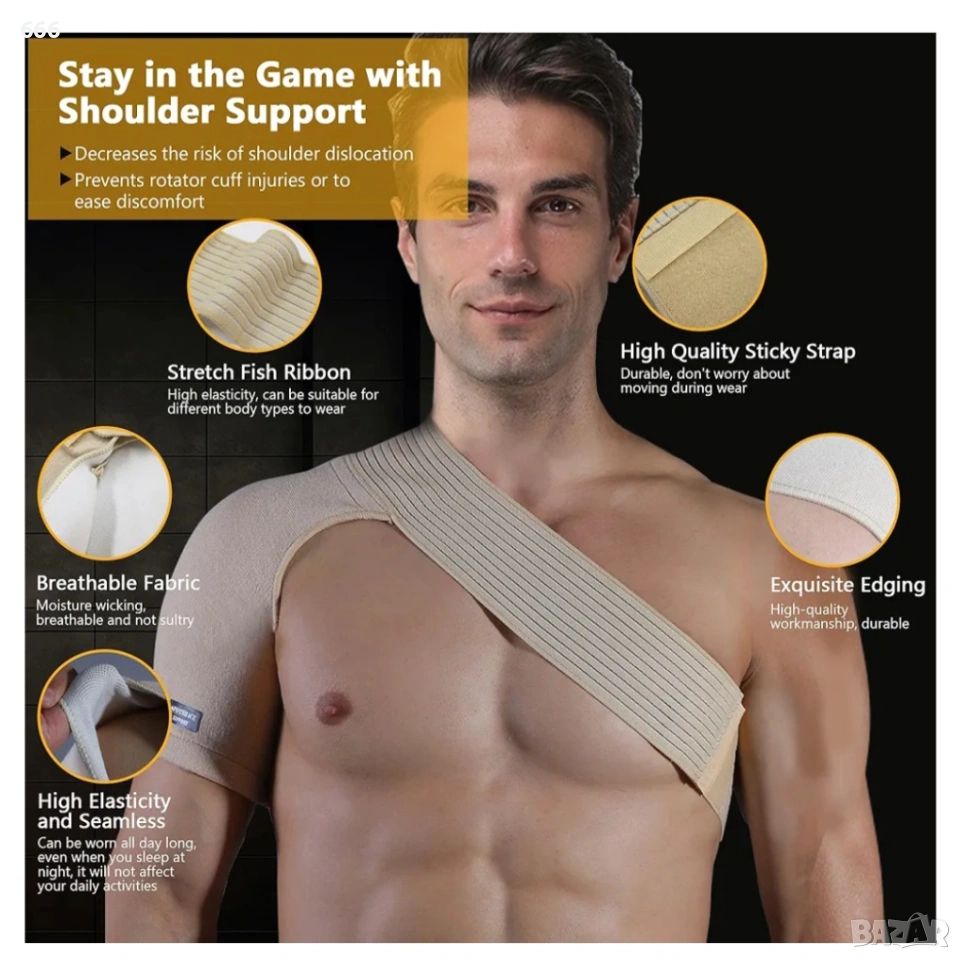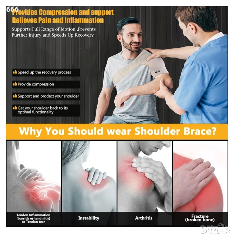 [Компресивна опора за рамо] Ортезата за рамо стабилизира раменната става, предпазва и поддържа рамото, антрацитната става и горната част на ръката и предотвратява допълнителни наранявания. Тази раменна превръзка осигурява облекчение при навяхвания, разтежения, скъсан ротаторен маншон, замръзнало рамо от изкълчена антрацитна става, разделяне на антрацитната става, бурсит, разкъсване на лабрума, тендинит, скованост на ставите и други.