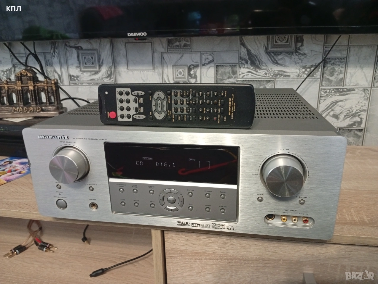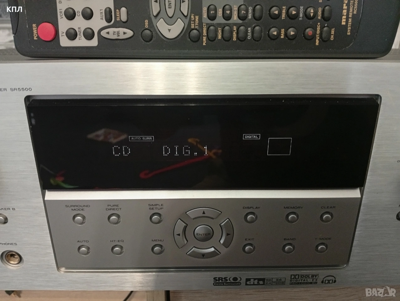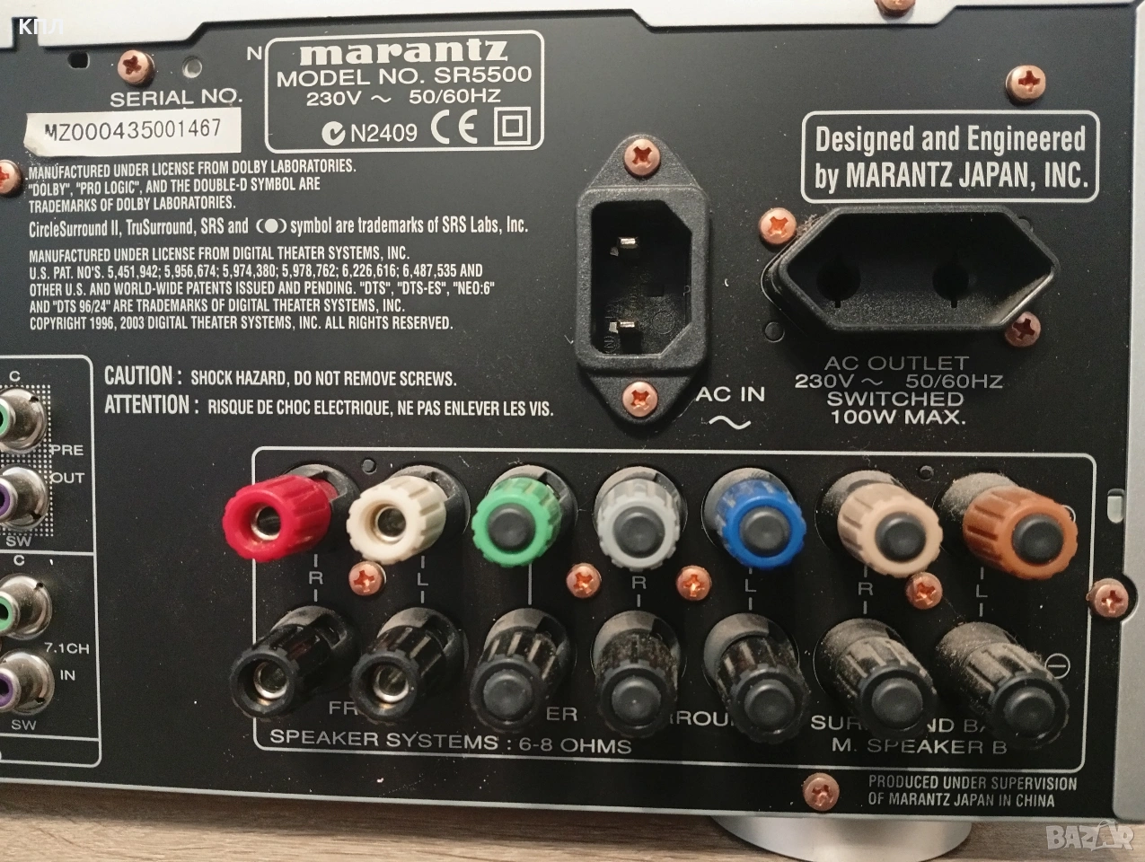 ресивър Marantz SR 5500 в отлично техническо състояние без ремонти внос от Германия при интерес може да се види и тества на място.Потопете се в първокласен звук и се насладете на всички прелести на домашното кино с ресивъра Marantz SR 5500. Това устройство е истинско богатство от функции и производителност, идеално за всички любители на качествения звук. ключови характеристики: Мощност: 90W на канал (8 ома) x 7 канала - достатъчно за всички, освен за най-големите помещения или най-неефективните високоговорители.Формати за съраунд звук: Dolby Digital EX®, Pro Logic IIx® (филм/музика/игра), DTS 96/24, ES® (дискретен 6.1/матричен 6.1), Neo:6 (кино/музика), SRS Circle Surround II®.Усилване: Всички дискретни усилватели с "токова обратна връзка". Процесор: 32-битов DSP.Цифрово-аналогови преобразуватели: 192kHz/24-битови за всички канали. Dolby Headphone: За най-доброто звуково изживяване през слушалки.Преобразуване на видео сигнал: Композитен/S-Video към компонентен - насладете се на високо качество на картината. Многостаен/Многоизточник: Свързване с други източници на звук и различни стаи.Управление на синхронизацията на устните: Синхронизиране на звук и изображение.Екранно меню: Лесно и бързо настройване чрез екрана.Режим Pure Direct: Изключете ненужните компоненти за чист звук.Режим на изключено видео: Изключете видеото за по-добро аудио качество.Променлив кросоувър: Адаптивност към високоговорителите.HD съвместимо видео превключване: 2 входа/1 изход. Цифрови входове/изходи: 4 входа (2 оптични/2 коаксиални), 2 изхода (1 оптичен/1 коаксиален).A/V входове на предния панел: За лесно свързване на видеокамера, DVD плейър или игрова конзола. Памет за 50 станции: За любими радиостанции.Включва предварително програмирано дистанционно управление на системата. Размери и тегло:Размери (ШxВxД): 435 x 167 x 394 ммТегло: 12,08 кг