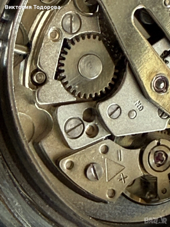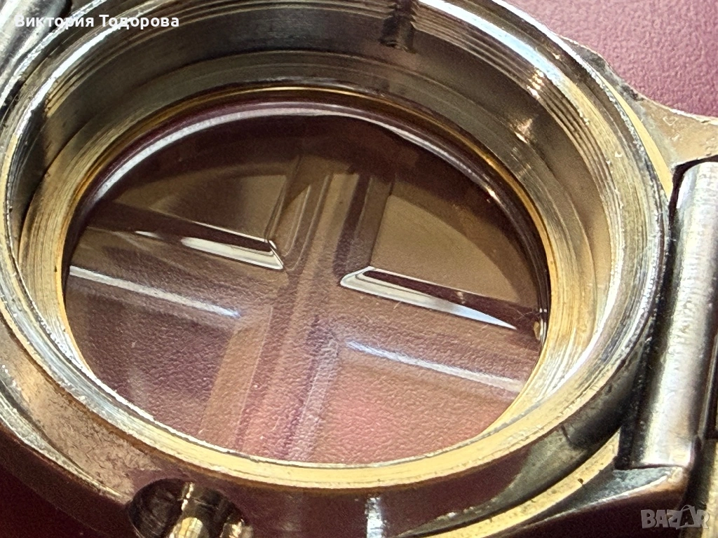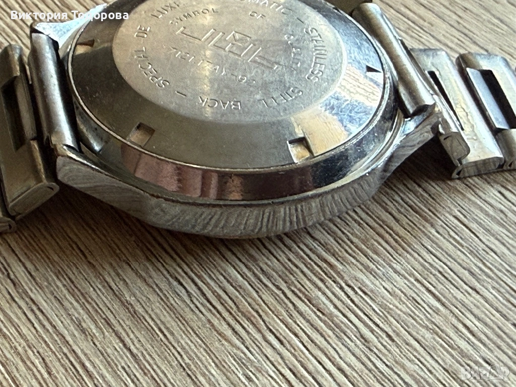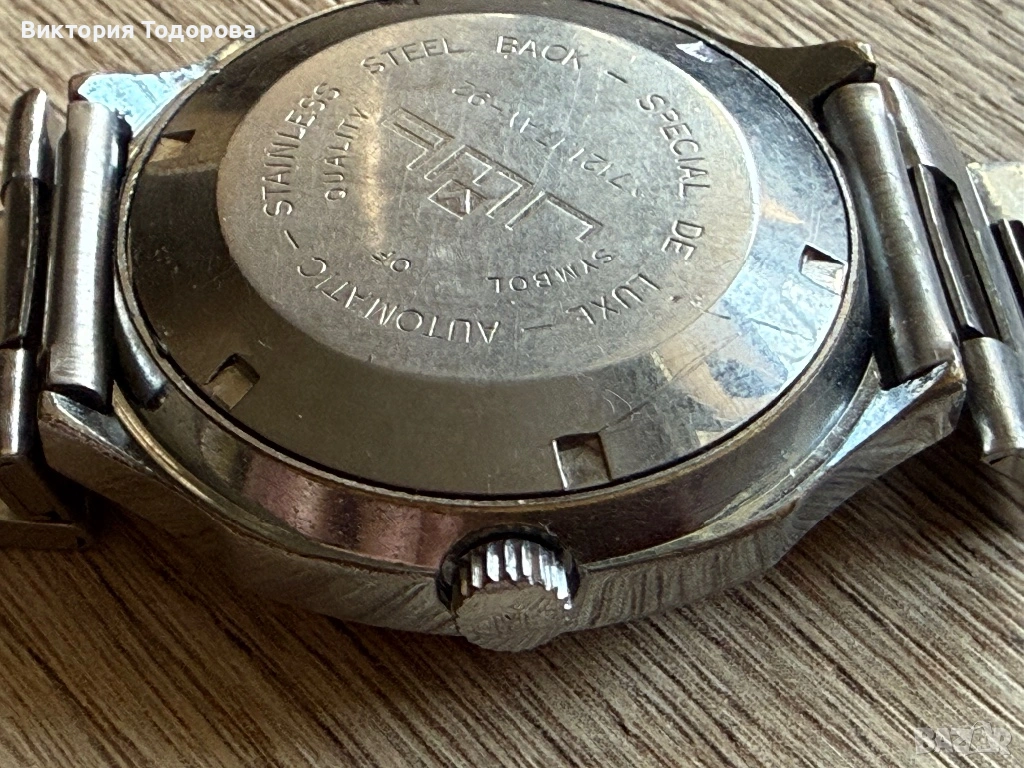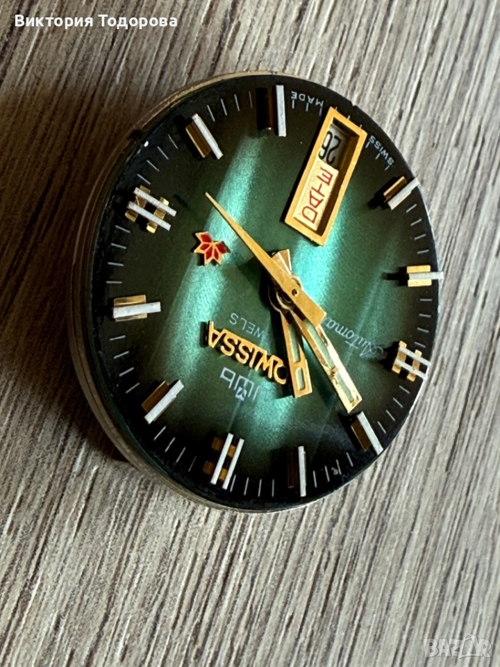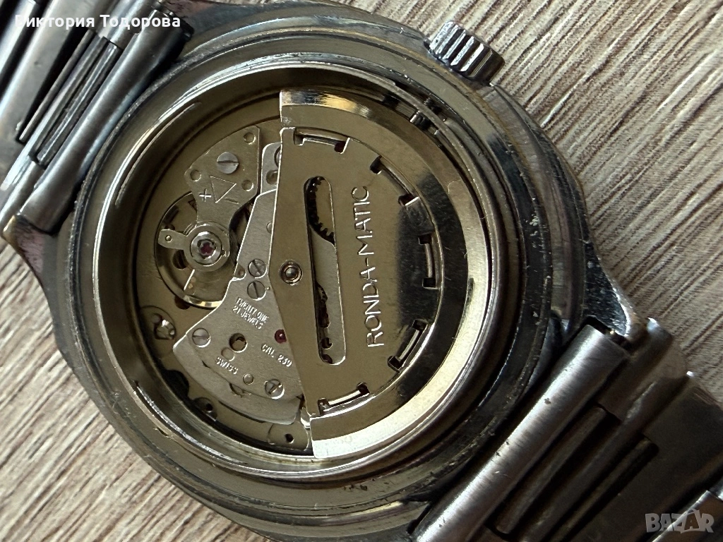 Здравейте! Предлагам добре работещ и запазен стар мъжки автоматичен часовник. Машината е Ronda cal. 239 с 21 камъка произведена в Швейцария. Стъклото е оригинално с релеф от вътрешната страна. Безелът е позлатен и има не дразнещи следи от износване. Поддържа почти точно време. Верижката става за китка 20 см. Циферблат и стрелки перфектни. Брандирана коронка с логото на часовника. При отваряне на задния капак се скъса уплътнителната гума.