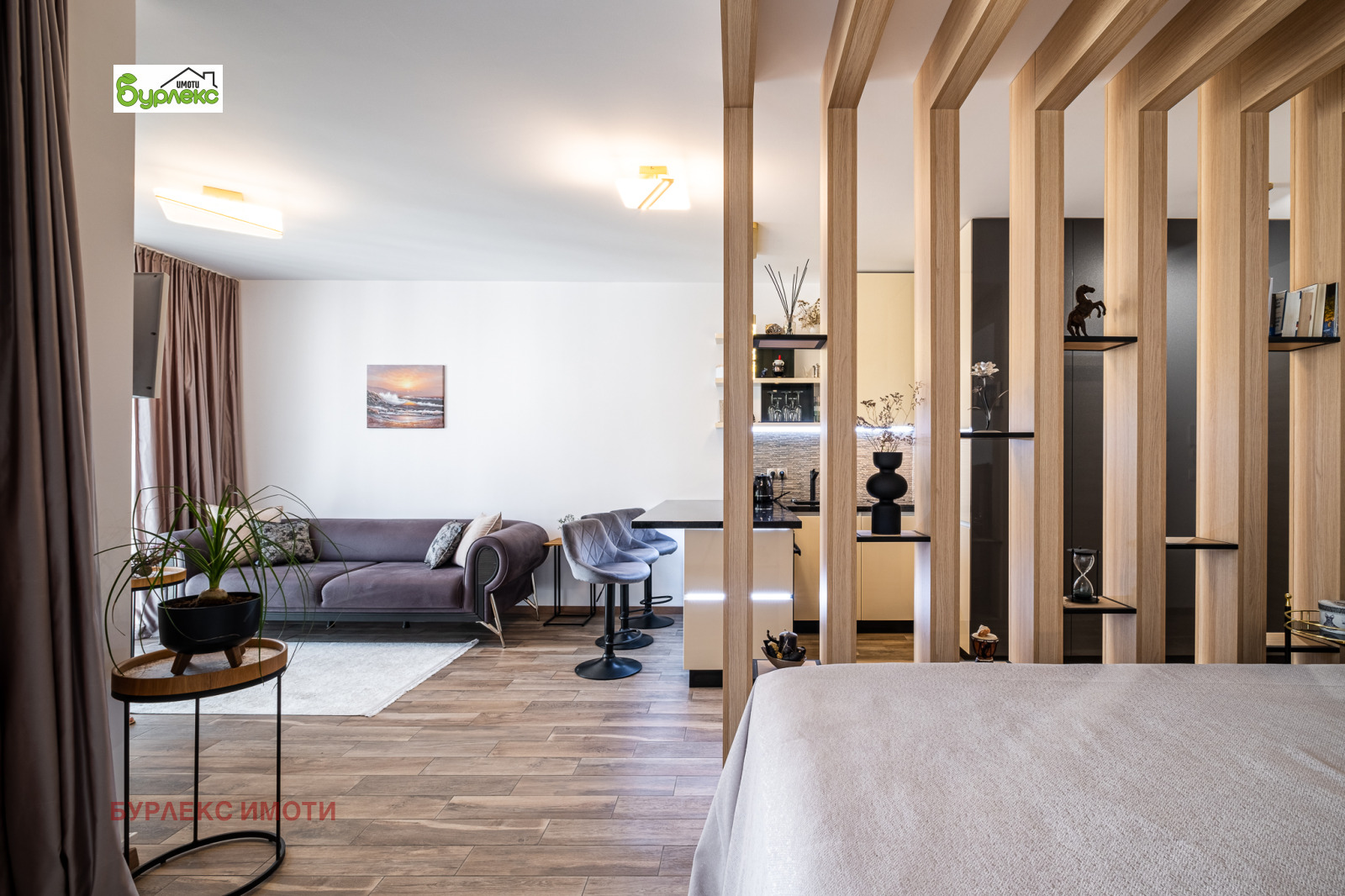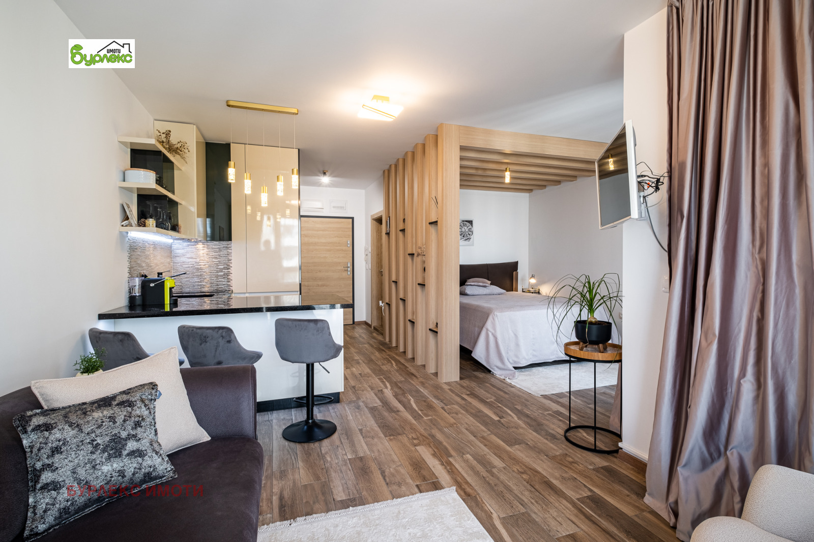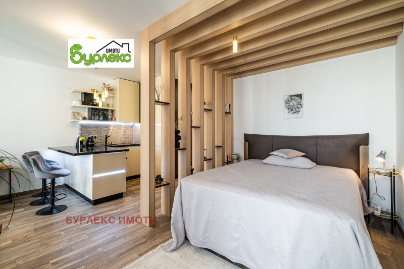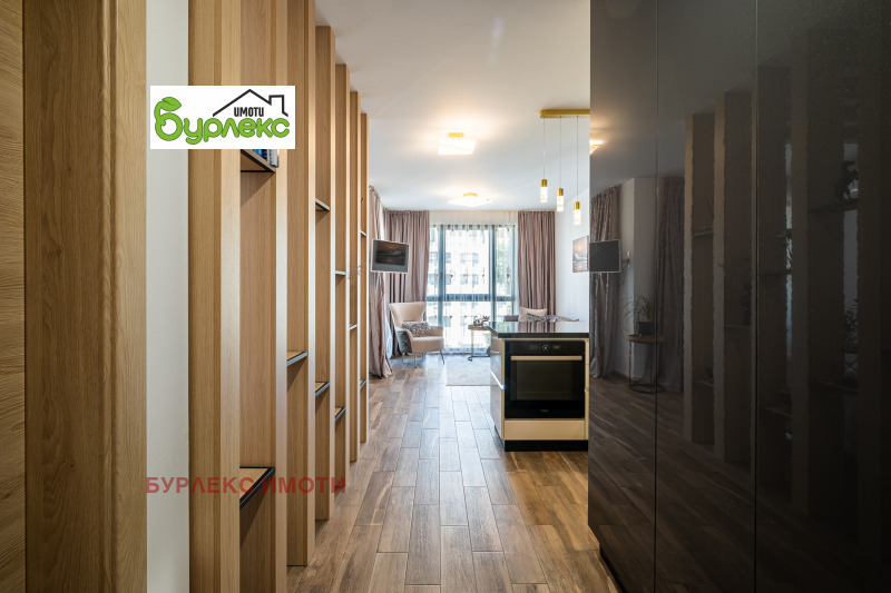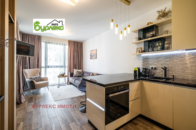 Апартаментът е едностаен, на площ от 54 м2 са обособени дневна зона, кухненски кът, зона за спане, съвместим санитарен възел, тераса. Цялото пространство е завършено с качествени материали, обзаведено с красиви и стилни мебели, висок клас електроуреди.