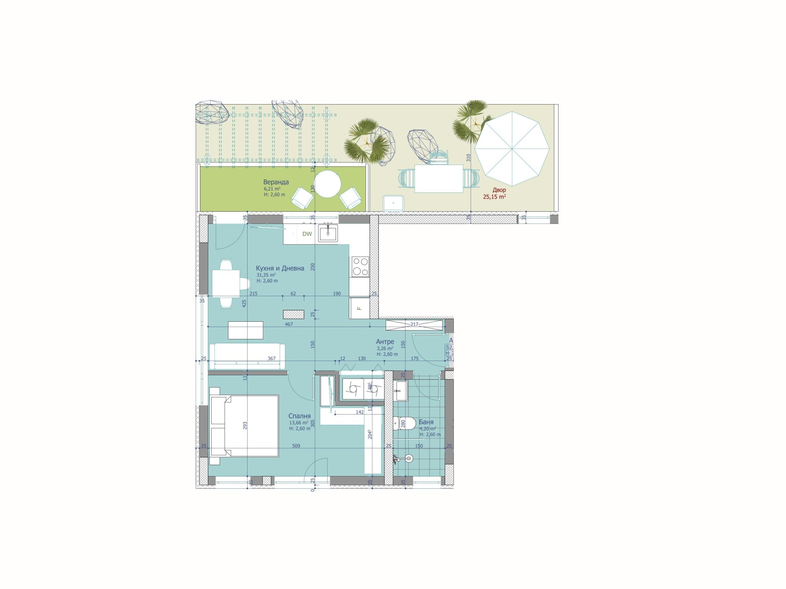 Конкретният апартамент разполага с голям хол, една спална, баня с тоалетна, антре, веранда и собствен двор, създаващ уют, спокойствие и усещане за живот на село, в условията на интензивна градска среда.