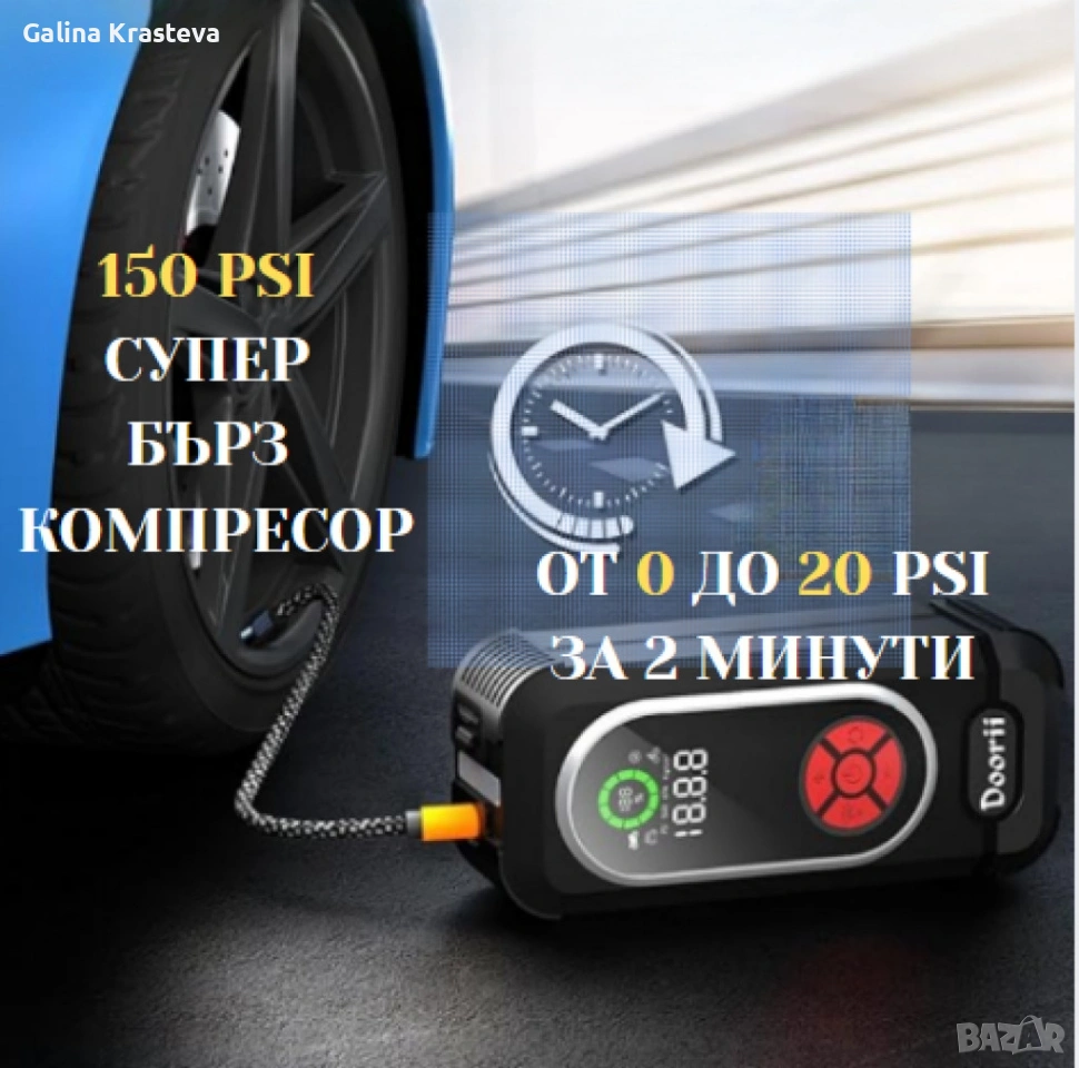 Ако се намирате на пътя и неочаквано ви спре колата поради спукано гума или празен акумулатор, няма нужда да се паникьосвате. Този портативен компресор за гуми и стартер за автомобил е решението, което ви трябва. С максимално налягане от 150 PSI, той може да надуе гума от 0 до 20 PSI само за 2 минути, а в допълнение предлага и стартиране на колата с помощта на вградените кабели за акумулатор.