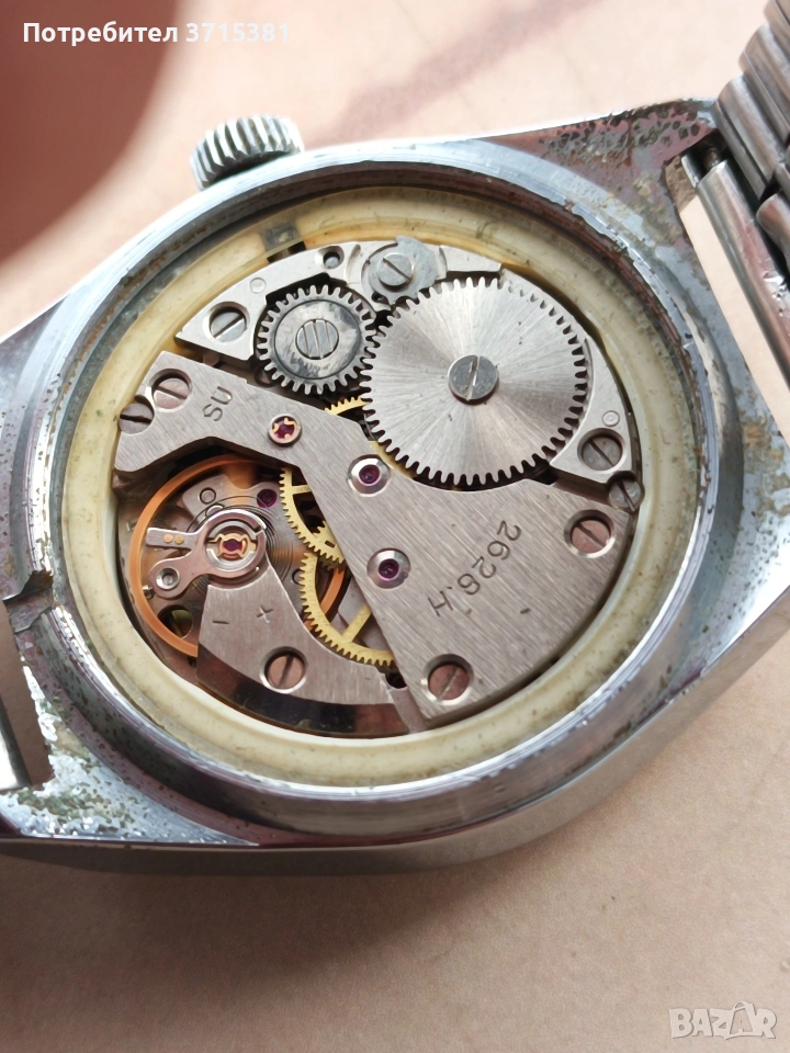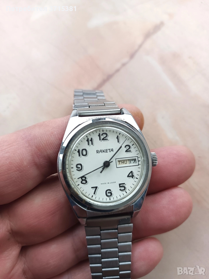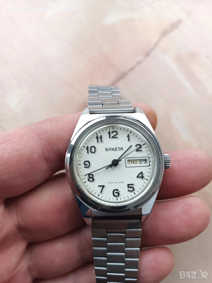 Часовник Ракета - работещ, сменя ден/ дата. Забележка- пукнатина на стъклото на 8 часа.