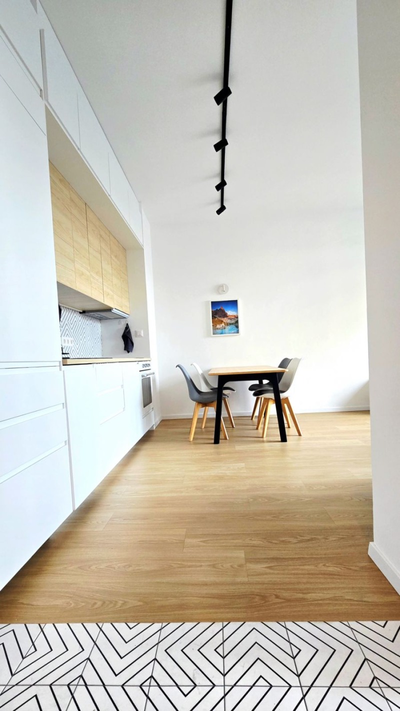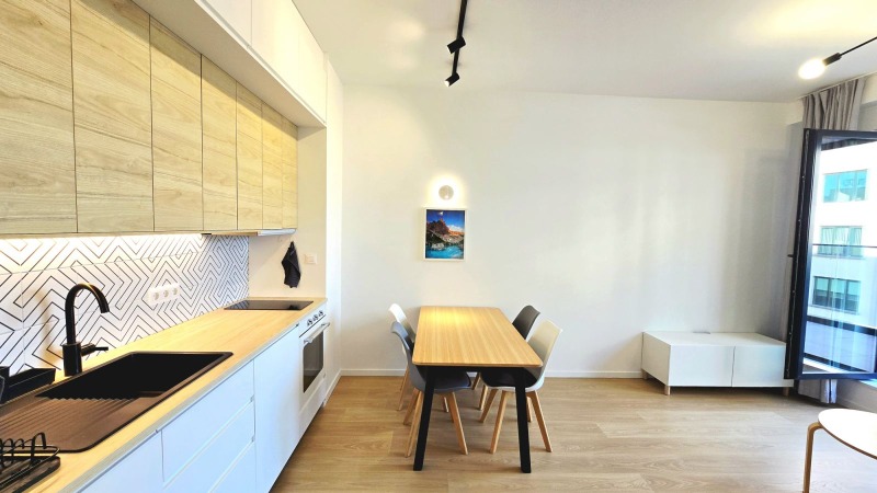 Дневната разполага с комфортен диван с функция сън. Кухнята е напълно оборудвана с вградени електроуреди от висок клас: фурна, индукционен котлон, аспиратор, хладилник, миялна машина, пералня със сушилня.