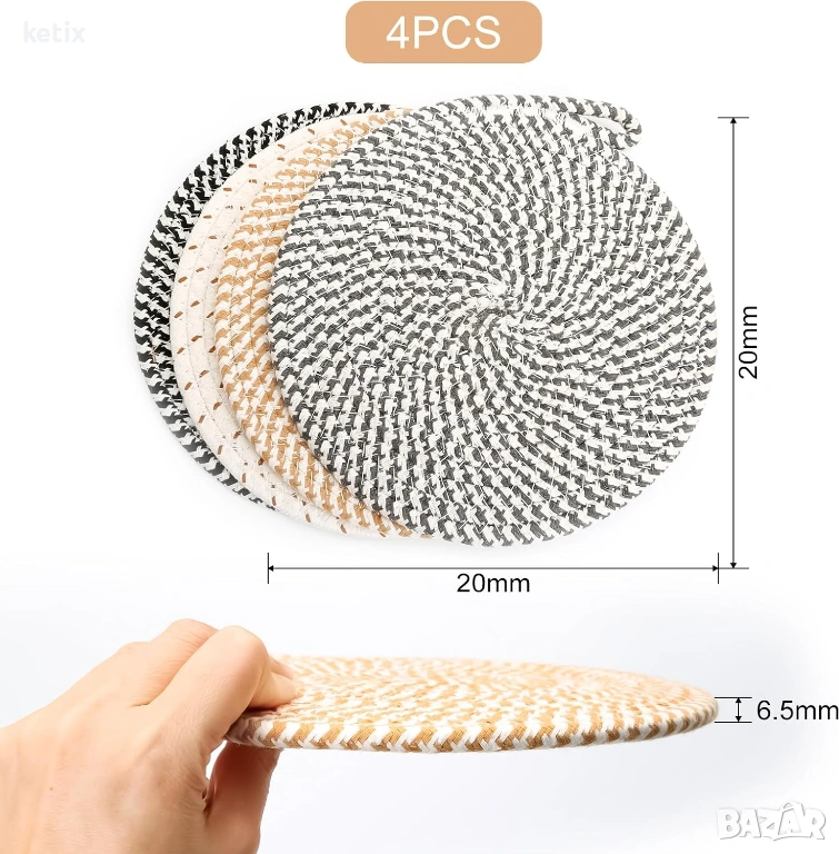 Памучна подложка за чаши- Подложката за чаши е изработена от висококачествен плетен памук, който е здрав и издръжлив и осигурява отличен топлоизолационен ефект. Материалът надеждно предпазва масите и работните плотове от горещи тенджери, тигани или други кухненски прибори. В същото време памукът е дишащ, абсорбиращ и може да се пере, така че замърсяванията или петната могат лесно да се отстранят, а подложките винаги остават хигиенично чисти.