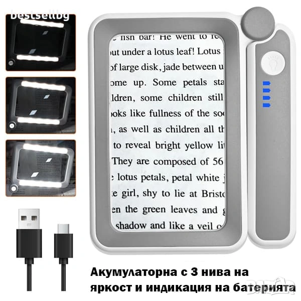 Акумулаторна правоъгълна увеличителна лупа с LED осветление ръчна за четене на книги USB зареждане