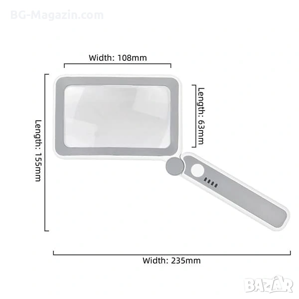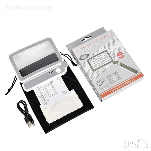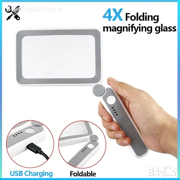 Акумулаторна правоъгълна увеличителна лупа с 4x увеличение, 10 LED диода и сензорно управление