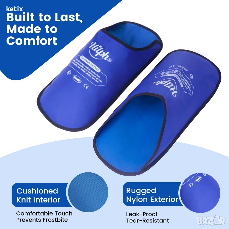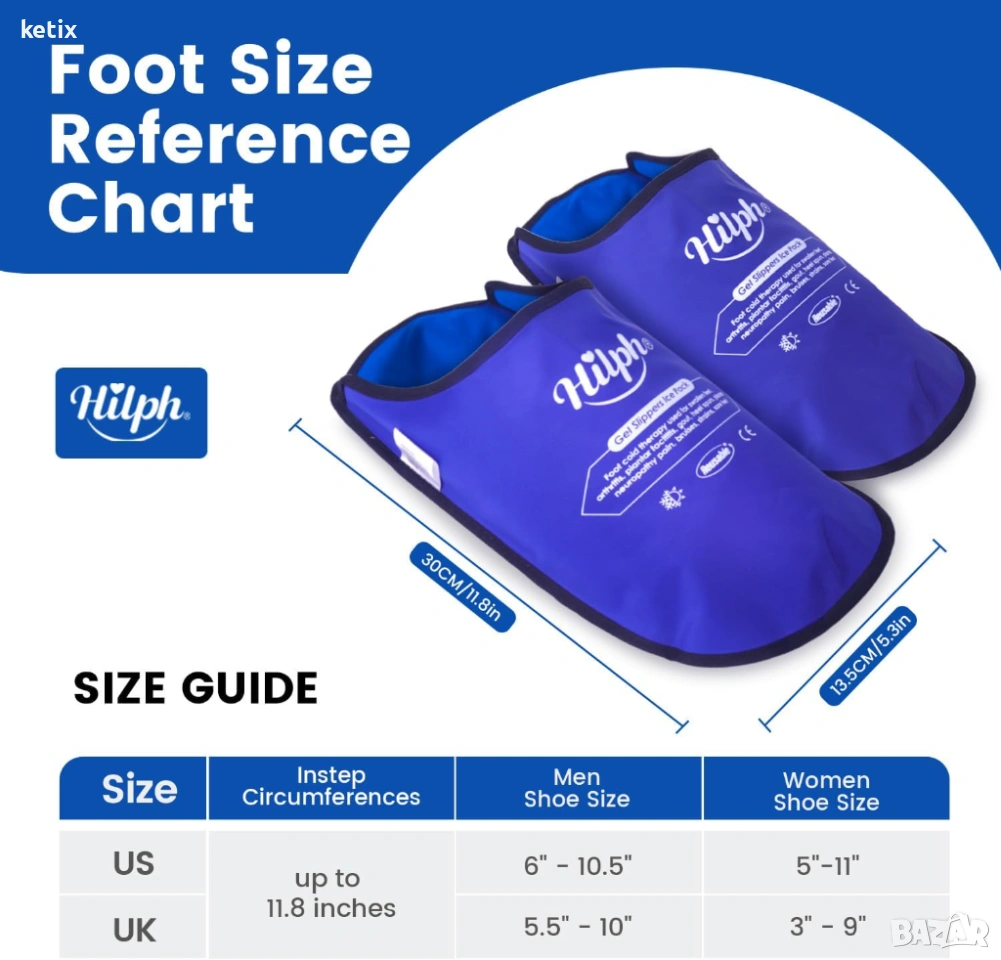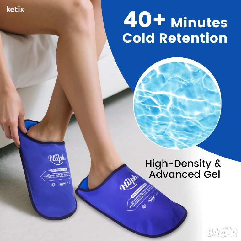 Универсален и унисекс дизайн: Чехлите Hilph Foot Ice Pack (30,5 см x 14,3 см) предлагат унисекс облекчение за уморени и подути крака. Проектирани за целодневен комфорт, тези чехли с пълно покритие обхващат пръстите, сводовете, стъпалата и плантарните крака, с охлаждаща гел подплата, която облекчава болката и намалява отока до 25 минути. Идеални са за дълги дни с тесни обувки, дискомфорт, свързан с бременност, или възстановяване след тренировка, а еластичната им материя, която може да се пере в пералня, осигурява плътно и неплъзгащо се прилягане. Размерът им е във Великобритания и са универсални за ляво и дясно крака, осигуряват незабавно охлаждане без претенции за хирургическа намеса - просто практична и лесна грижа за краката.