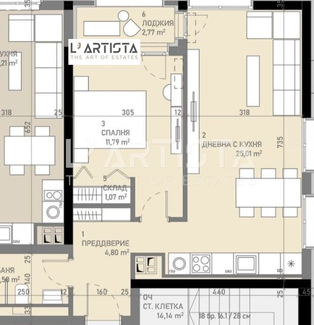 L' Artista предлага светъл и просторен апартамент с френски прозорци, които изпълват жилището с естествена светлина и разкриват прекрасна панорамна гледка. Имотът се намира на 13-ти етаж в модерна 18 - eтажна сграда пред акт 14