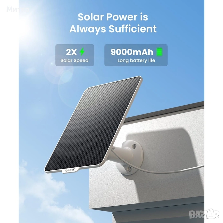 【Целогодишна слънчева енергия】Поддържайте сигурността си захранвана от слънчева енергия през цялата година. Вградената батерия от 9000 mAh гарантира, че камерата работи дори в облачни дни или периоди без слънчева светлина. Насладете се на напълно безжична инсталация и непрекъсната, безпроблемна защита.