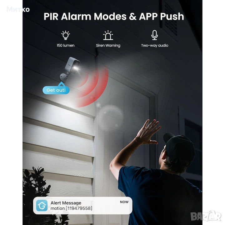 【Интелигентни известия и двупосочен звук】Усъвършенстваното PIR разпознаване на движение ви предупреждава незабавно за хора - не за домашни любимци или вятър. Персонализирайте зоните за разпознаване и получавайте push известия в реално време. С вграден двупосочен звук можете да говорите с посетители, да предупреждавате натрапници или да комуникирате от разстояние с лекота.