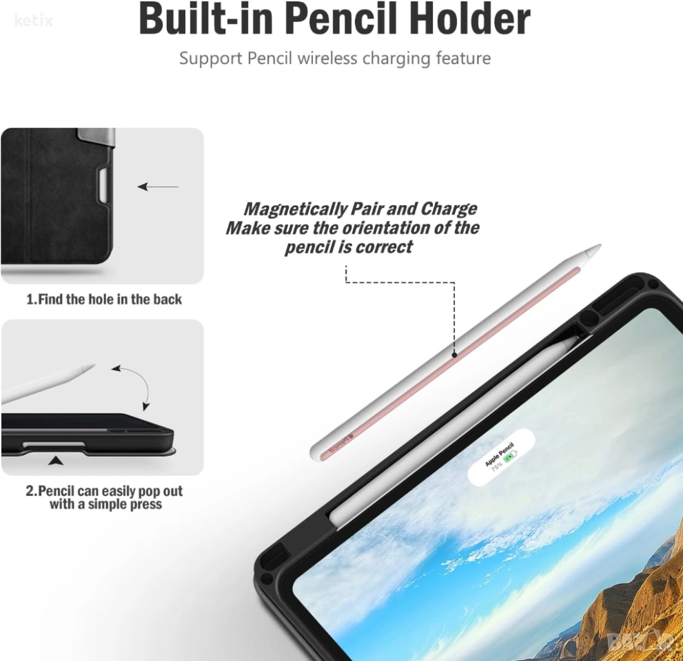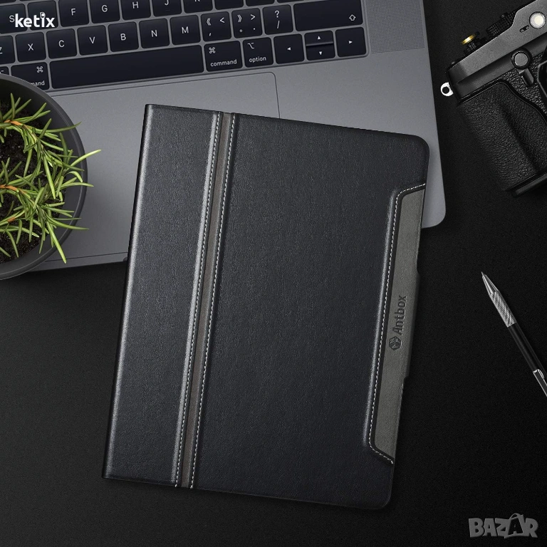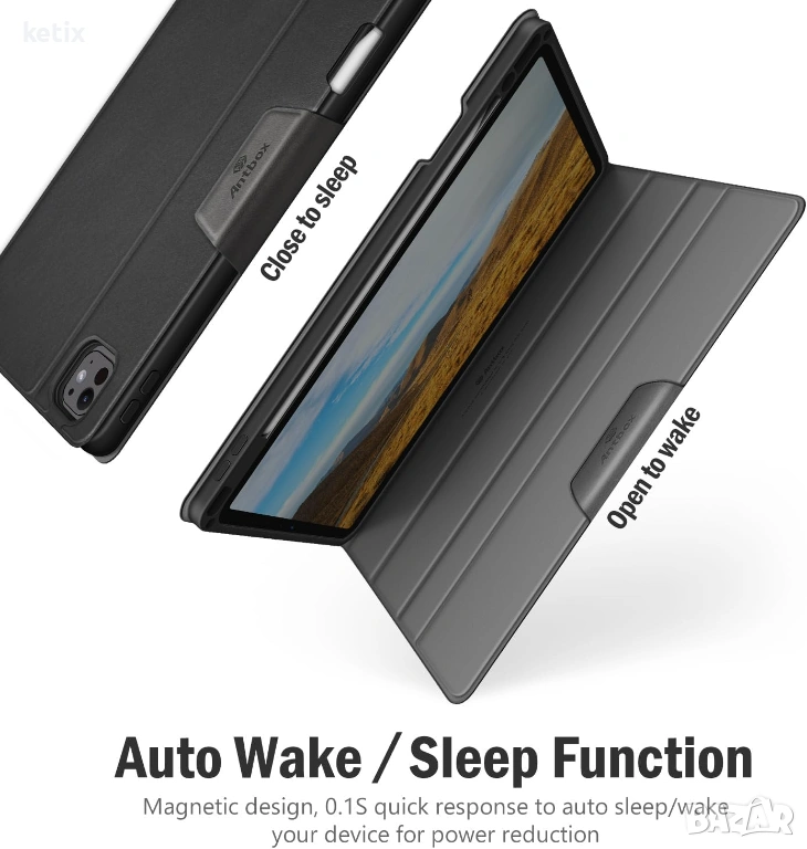 - Вграден държач за молив-Калъфът Antbox държи сигурно Pencil-а, поддържа безжично зареждане и сдвояване за Pencil Pro и го закрепва магнитно (USB-C) без да го сваляте. (Продуктът не включва Pencil.)