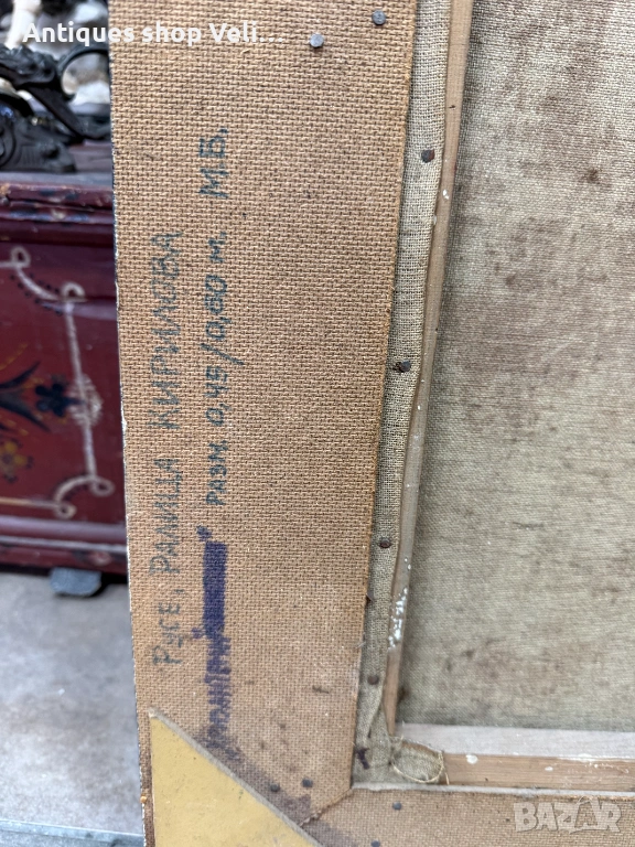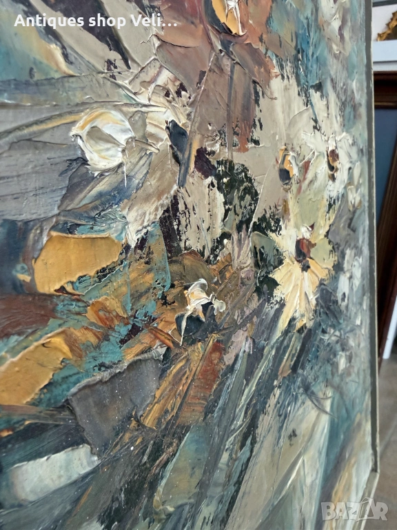Оригинално авторско платно с ясно изразен релеф. Композиция с хризантеми във ваза. Картината е надписана отзад с име на автора. Добро състияние с няколко дребни забележки. Предлагаме доставка с Еконт и лично предаване за градовете Велико Търново, Русе и Сливен! Размери-45/60см.