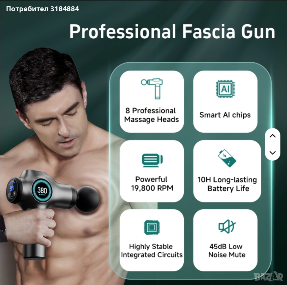 Мощен перкусионен масажор с 99 степени на скорост и до 3200 об./мин, подходящ за отпускане на мускулите и облекчаване на напрежението. Разполага с 8 сменяеми глави за различни части на тялото.