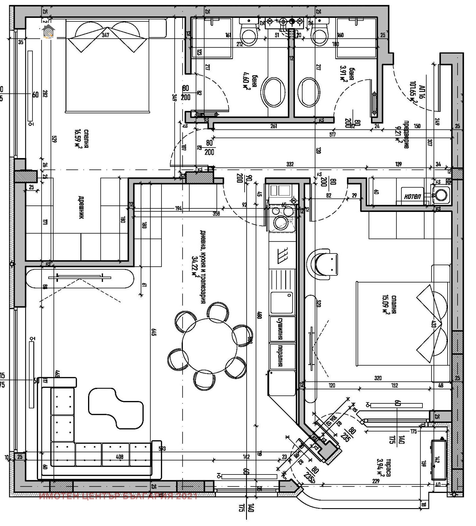 - Имота се състои от: голяма дневна с кухненски бокс (34,22 кв.м) с изложение юг и прекрасна гледка директно към Витоша . Две спални с площ 17 кв.м. и 15 кв.м. , антре - 9 кв.м. , две бани с тоалетна и тераса .