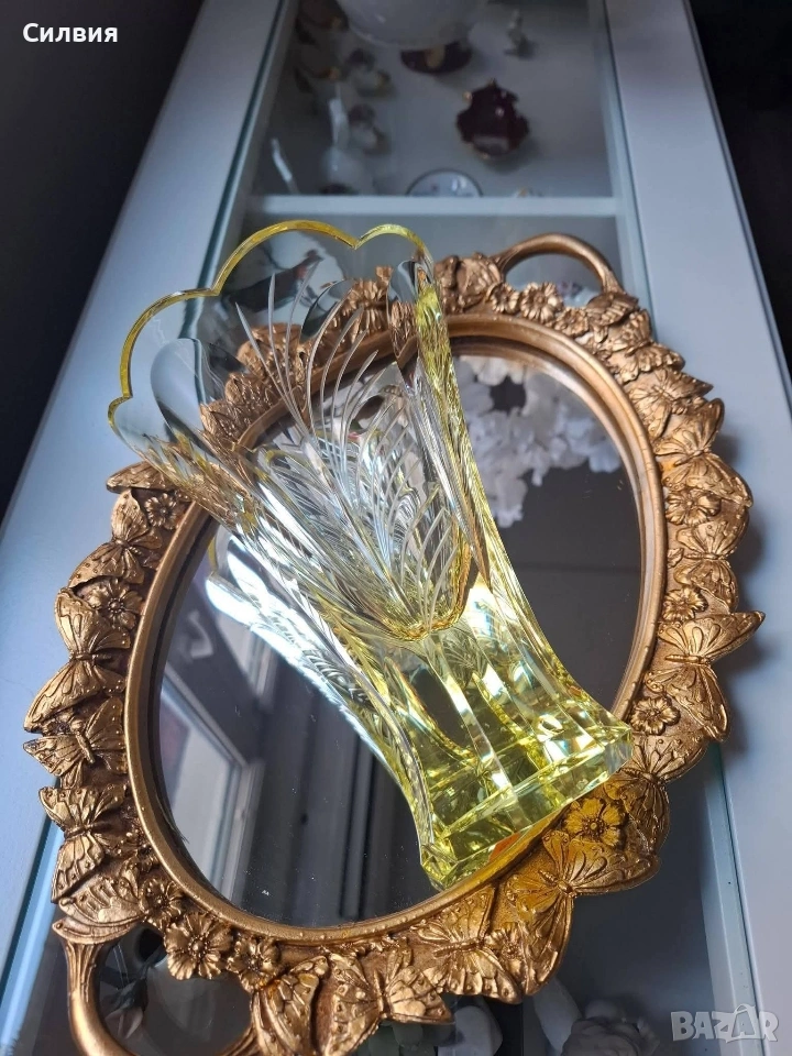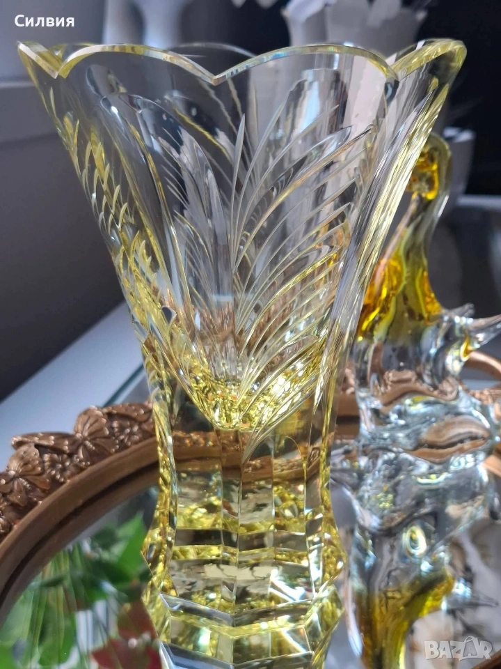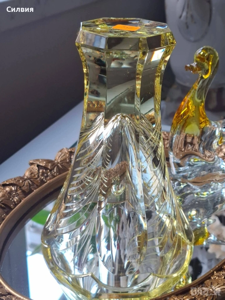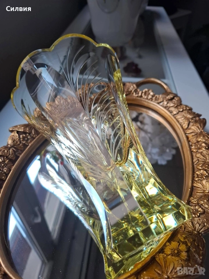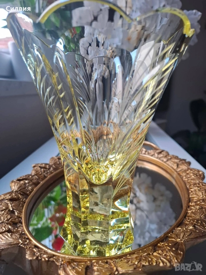 Цитрин“ от Рудолф Хлоушек 🌟 Пред Вас стои изключителна ваза, която е вдъхновено въплъщение на елегантността от епохата Арт Деко. Изработена от стъкларската фабрика Železný Brod около 1930 г., тази луксозна ваза е проектирана от майстора Рудолф Хлоушек. Тя пленява погледа със своя великолепен цитринен цвят, излъчващ мека, слънчева светлина, която придава топло и оптимистично излъчване на всяко пространство. Интензивният жълт оттенък, напомнящ скъпоценния камък цитрин, я прави ярък акцент и свидетелство за изтънчения вкус от 30-те години. Отличава се с грациозна, разширяваща се форма, която кулминира в елегантно вълнообразен, цветен венец на отвора. Детайли: Основната ѝ красота се крие в сложната ръчна декорация. Всяка фасетка и издълбан елемент са прецизно изработени. Врязаните вертикални и диагонални линии създават динамичен, лъчезарен ефект, който улавя и разпръсква светлината, подчертавайки геометричния и модернистичен дух на Арт Деко. Масивната, многоъгълна основа осигурява стабилност и добавя монументално, скулптурно усещане към цялостния дизайн. Тази ваза е не просто съд, а колекционерски артикул и произведение на изкуството, което носи духа на своето време – едновременно луксозно, стилно и вечно. Тя е идеален фокусен център, достоен да украси най-изискания интериор. Висока-18см. Диаметър 13см. Дъно- 6,5см. Цена 1️⃣2️⃣8️⃣€. (250,35лв) •✽✧✽•°”˜🌼”°•✽✧✽•°”˜🌼”°•✽✧✽•°”˜🌼”°•✽✧✽•°”🌼˜”°•✽✧✽•