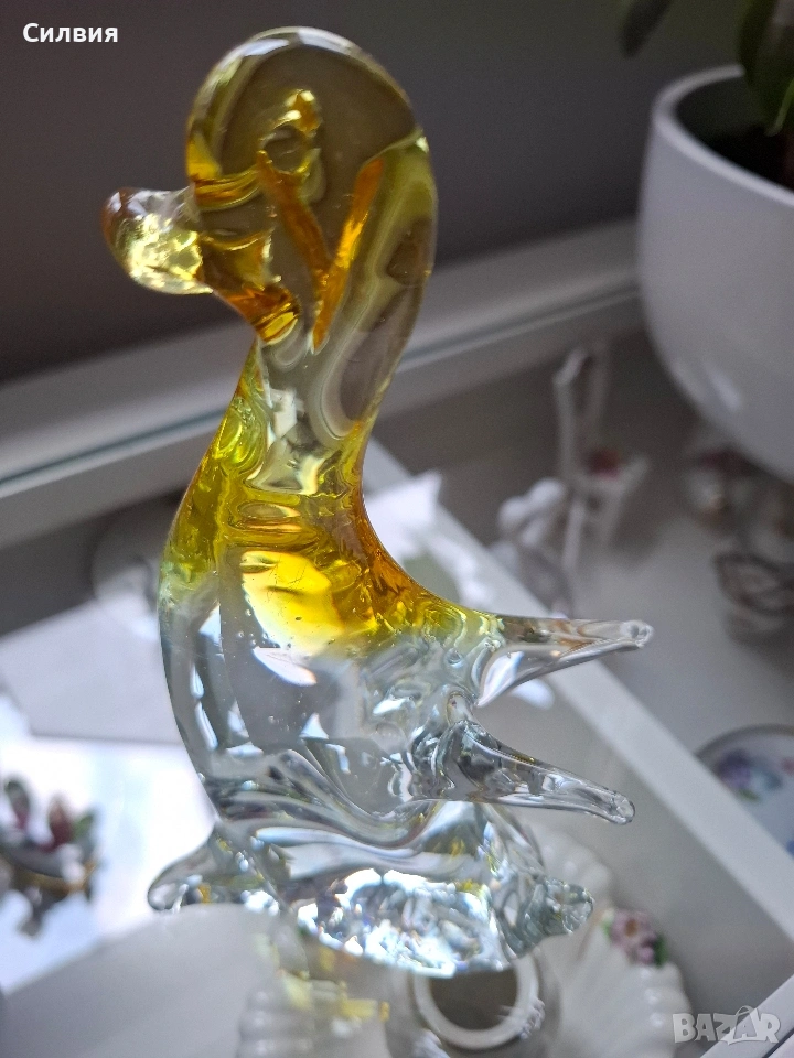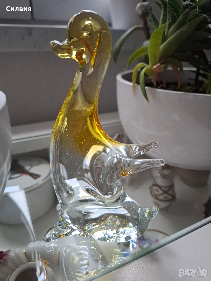 рафт или колекция. Висококачествено, плътно духано стъкло. Фигурката е майсторски оформена, като улавя елегантното извиване на патешката шия и тяло във вода. Отличава се с красив двуцветен преход (сфумато ефект) от кристално прозрачно стъкло в основата към наситено кехлибарено/златисто жълто в горната част и главата. Жълтият цвят е "уловен" вътре в прозрачното стъкло, което придава дълбочина и блясък. Напомня изработката на прочутото Мурано стъкло от Венеция, известно с изящните си анималистични фигурки и живописните цветове, въведени в масата на стъклото. Размери: Височина: Около 14,5см. Отлично допълнение към всяка колекция от арт стъкло или животински фигурки. Играта на светлината през стъклото и кехлибарения цвят създава топъл и луксозен ефект. Състояние: Отлично, без забележки. Цена: 3️⃣8️⃣ € // 74,32лв. •✽✧✽•°”˜🦋”°•✽✧✽•°”˜🦋”°•✽✧✽•°”˜🦋”°•✽✧✽•°”🦋˜”°•✽✧✽•