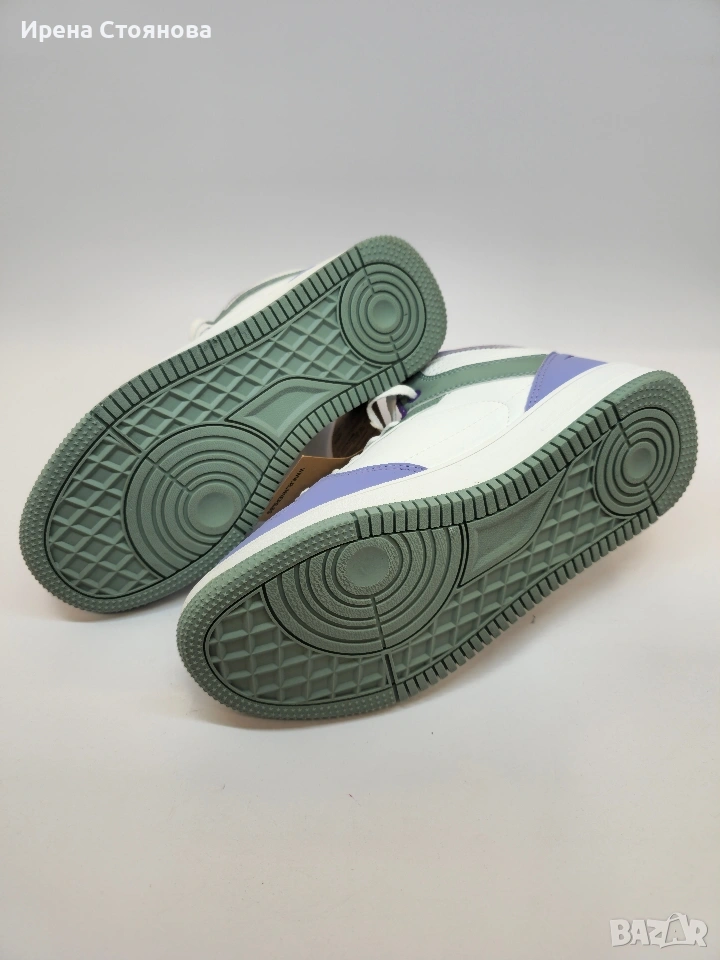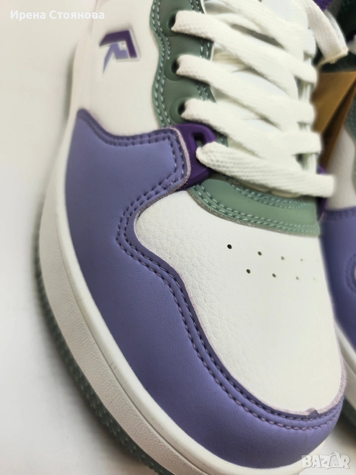 Чисто нови Дамски/юношески кецове в размер 39 (стелка 25,5 см) с комбинация от бяло, лилаво и зелено. Моделът е много удобен и придава усещане за стабилност заради височината си. Горната част е изработена изцяло от еко.